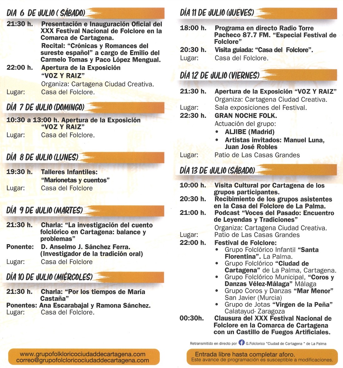 Recién comenzado el mes de julio, la diputación cartagenera de La Palma se llena de melodías de levanticas, malagueñas y jotas. Los jóvenes integrantes del Grupo Infantil “Santa Florentina” ya se afanan en preparar sus tradicionales refajos, pañuelos y postizas, mientras el Grupo Folclórico “Ciudad de Cartagena” se apresta a abrir las puertas de su casa para recibir a visitantes y amigos. Durante una semana, la localidad ofrecerá un amplio abanico de propuestas en torno a la música, el baile, el arte y la tradición más auténtica y arraigada a nuestra tierra, conectando a todos con nuestras raíces y nuestro folclore.El sábado 6 de julio, a las 21:30 horas, se llevará a cabo la presentación e inauguración oficial del XXX Festival Nacional de Folclore en la Comarca de Cartagena, que cuenta con el apoyo del Ayuntamiento de Cartagena, este año dedicado al cuento tradicional. La ceremonia contará con un recital titulado "Crónicas y Romances del Sureste Español", a cargo de Emilio del Carmelo Tomás Loba y Paco López Mengual, en la Casa del Folclore. Acto seguido, se inaugurará la exposición "Voz Y Raíz", organizada por la Asociación Cultural Cartagena Ciudad Creativa, en la que una veintena de pintores nos ofrecerán su particular mirada sobre aquellos cuentos que han dejado huella en sus vidas.