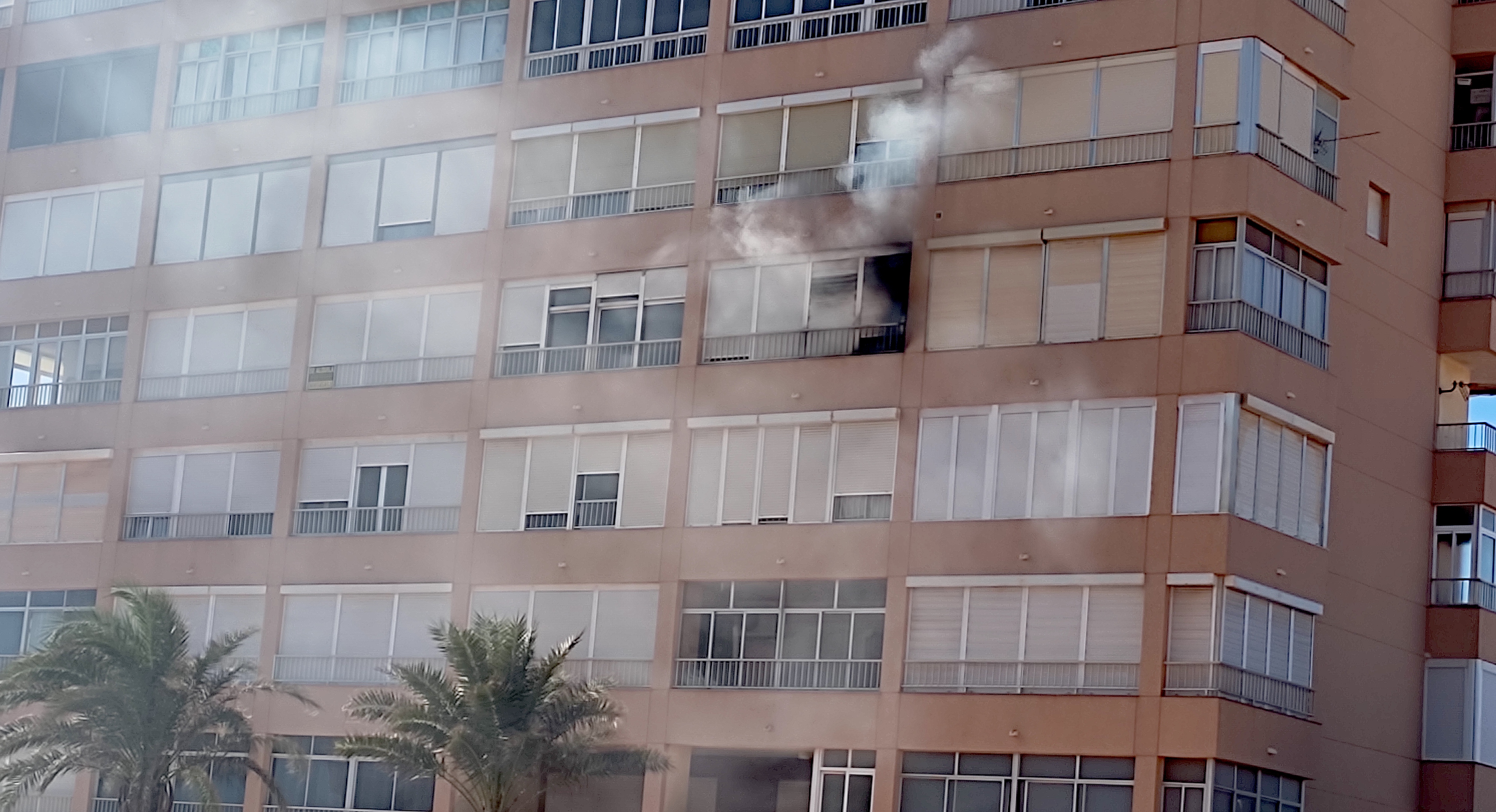 Un vecino remite a nuestro 'Buzón de los lectores' fotos del fuego que se ha declarado esta mañana en un inmueble de 14 plantas de la Gran Vía del turístico núcleo de población. Diez llamadas han avisado a los equipos de emergencia y, tras ser controladas las llamas, se ha atendido a un hombre de 43 años de edad que presentaba quemaduras en su cuerpo, siendo trasladado al Hospital de Santa Lucía.