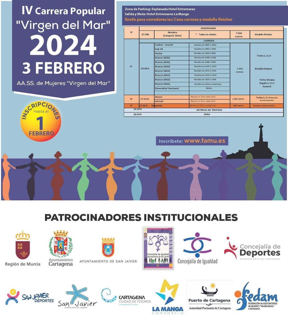 La Asociación de Mujeres Virgen del Mar organiza en la tarde del próximo 3 de febrero la prueba deportiva englobada en la liga de 'running' de la federación autonómica de atletismo. No se celebra desde 2020 y vuelve con la cuarta edición. La zona de salida y meta estará junto al hotel Entremares, donde a las 16 horas comenzarán las animaciones.