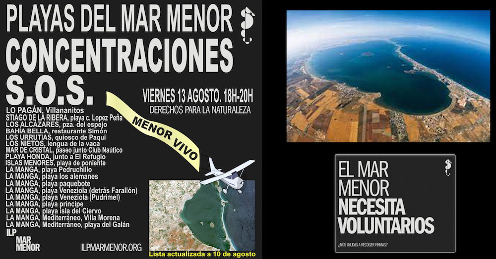 Nueve enclaves de La Manga junto a Islas Menores, Playa Honda, Mar de Cristal, Los Nietos, Los Urrutias, Bahía Bella, Los Alcázares, Santiago de la Ribera y Lo Pagán serán los lugares en los que se llevarán performances de 18 a 20 horas este 13 de agosto, reforzadas por una avioneta con mensaje. El objetivo es reforzar aún más el SOS para salvar la ‘laguna salada’ y seguir recogiendo firmas para conseguir el medio millón que hacen falta para que la albufera tenga entidad jurídica propia, lo que facilitaría enormemente ese objetivo por encima de intereses políticos.