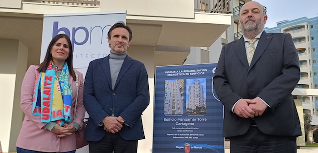 La Comunidad Autónoma concede ayudas a dos edificios y cuatro viviendas, situados en Cartagena, que supondrá que sus moradores vean reducida la factura de consumo eléctirco y mejorada la confortabilidad de sus hogares gracias al aislamiento térmico y acústico de los mismos. En la foto, las autoridades en el primer inmueble rehabilitado, que está en La Manga del Mar Menor.