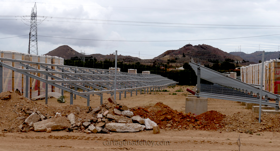 Imágenes del nuevo parque de energía solar que se está montando junto a la redonda de salida hacia Alumbres y Roche en la autovía sobre terrenos antes destinados a la agricultura.