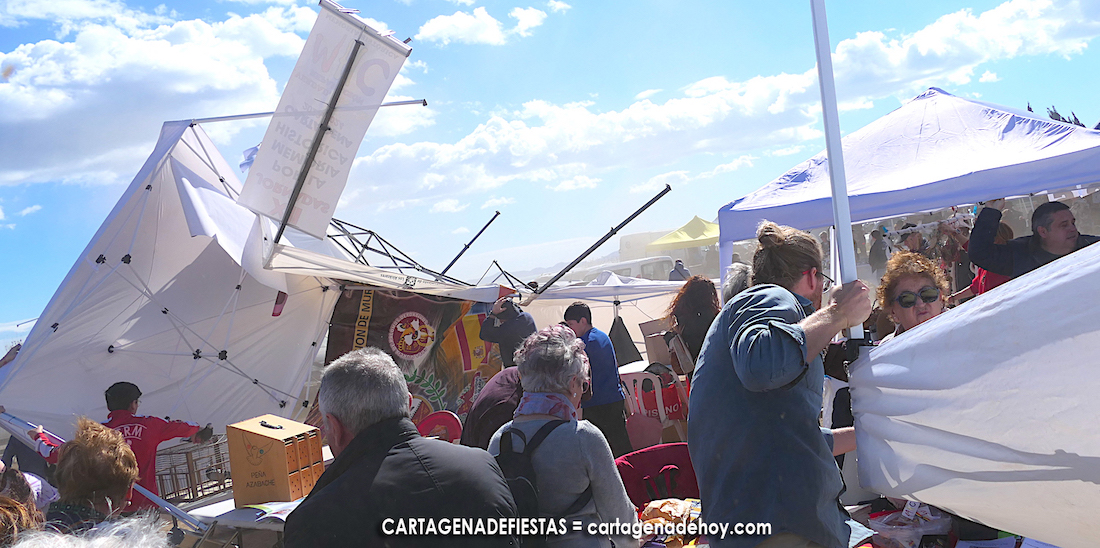 La fuertes ráfagas han lanzado varias carpas, llegando a golpear (sin causar daños) alguna a asistentes, además de cruzar la carretera una de ellas. La Favcac ha decidido aplazar para otra fecha este evento que se estrenaba en terrenos de Bahía Bella y que había congregado a 91 colectivos.