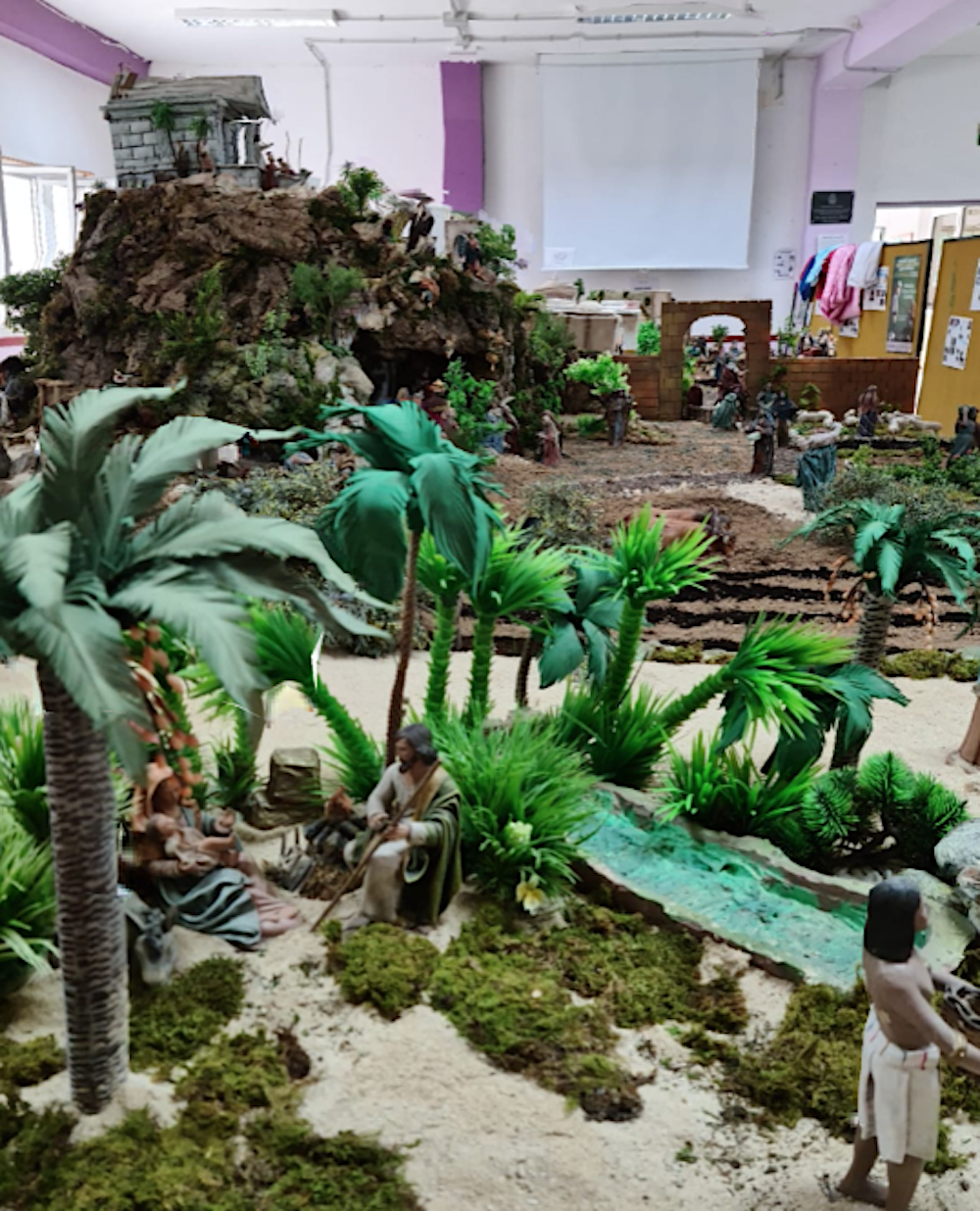 El gran nacimiento, en el que se distribuyen las poblaciones de Judea, Belén y Egipto, es elaborado cada año por Alfonso Sánchez y José Lisón, a quienes se observa en la imagen adjunta, en el salón de actos de la Barriada de Virgen de la Caridad. La puesta de largo será el 5 de diciembre a las 18 horas con actuaciones coreográficas de este grupo carnavalero y una recogida de alimentos, que tendrán como destino familias con escaso recurso.