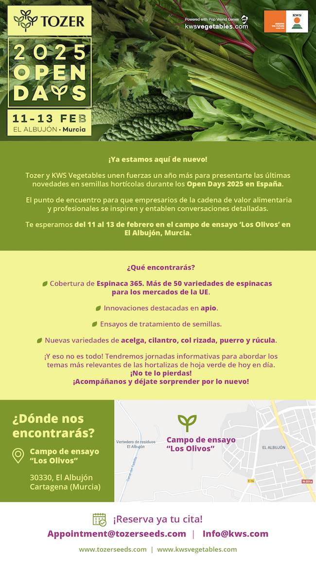 Un año más, Tozer expondrá en los 8.000 m2 de su campo de ensayo murciano sus últimas novedades en semillas hortícolas. Del 11 al 13 de febrero, los visitantes profesionales que acudan a visitarlo podrán descubrir un amplio surtido de apio, acelga, cilantro, kale, puerro, rúcula, cebolla para ensalada y espinaca. Hasta un total de 150 variedades, entre las que este año destacan las novedades en kale y apio.Cuatro nuevas variedades de kale verde, identificadas como TZ8279, TZ8276 y TZ8265, sobresalen por su producción, color y rendimiento. Además, el apio TZ9533, una innovación de doble aptitud, es la propuesta de Tozer tanto para el segmento de stick como para pre-pack. “Estamos muy orgullosos de estas innovaciones. Por un lado las mejoras obtenidas en kale son realmente notables. Por otro, la versatilidad de nuestro nuevo apio TZ9533 es imbatible, algo que sin duda sabrán apreciar los productores”, afirma Manuel Hernández, gerente de ventas para España y Portugal en Tozer Ibérica.