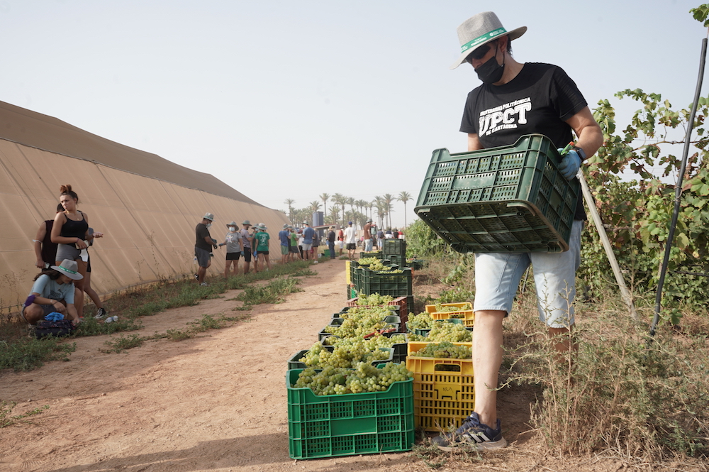 Un gorro para protegerse del sol, un almuerzo para mantener las fuerzas y una caja de vino. Así ha comenzado este año la vendimia de la añada 2021 en los viñedos de la Finca Tomás Ferro, de la Universidad Politécnica de Cartagena. De nuevo, distanciamiento social y medidas de protección, debido a la pandemia sanitaria. Alumnos y docentes voluntarios han recogido más seis mil kilos de uva merseguera en esta cita anual, una oportunidad para conocer el proceso de elaboración del vino, explica la directora de la Escuela de Agrónomos, Arantxa Aznar. Y este año, con la novedad de que a los alumnos que han participado, se les ha reconocido un crédito en su expediente académico.