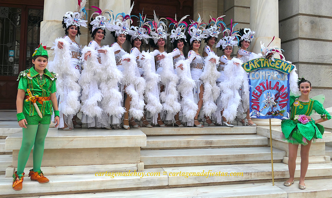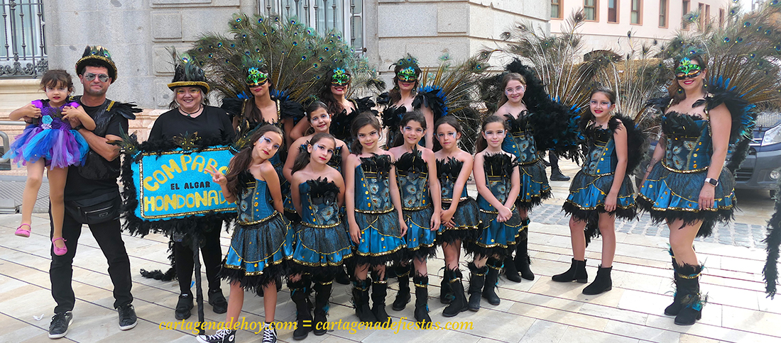 Integrantes de varias comparsas, como Divertilandia, Hondonada, Salgueiro y Paraíso, entre otras, han protagonizado esta tarde un desfile desde la calle del Carmen hasta la plaza del Ayuntamiento para anunciar, junto al lanzamiento de un castillo de fuegos artificiales, el inicio de una popular fiestas que por primera vez se celebra en junio.