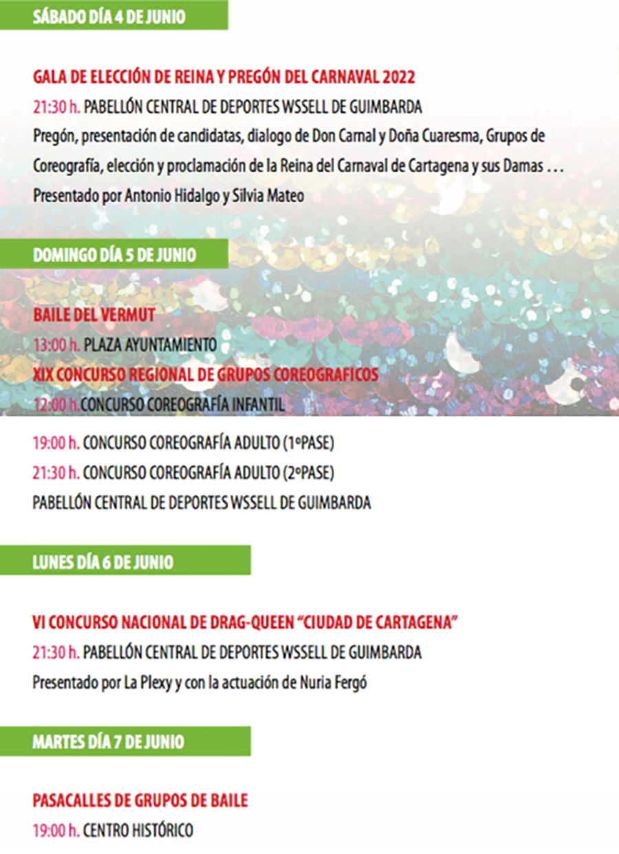 Esta noche tiene lugar la gala de apertura con el pregón (a cargo de la Autoridad Portuaria), el diálogo de Don Carnal y Doña Cuaresma (José Félix Díaz Parrón y María José Aznar Castro, de Salgueiro, respectivamente) y, además de actuaciones, la elección de la reina y sus damas. Presentan Antonio Hidalgo y Silvia Mateo. El domingo es para el baile del vermú y los concursos de coreografías infantil y adulto.