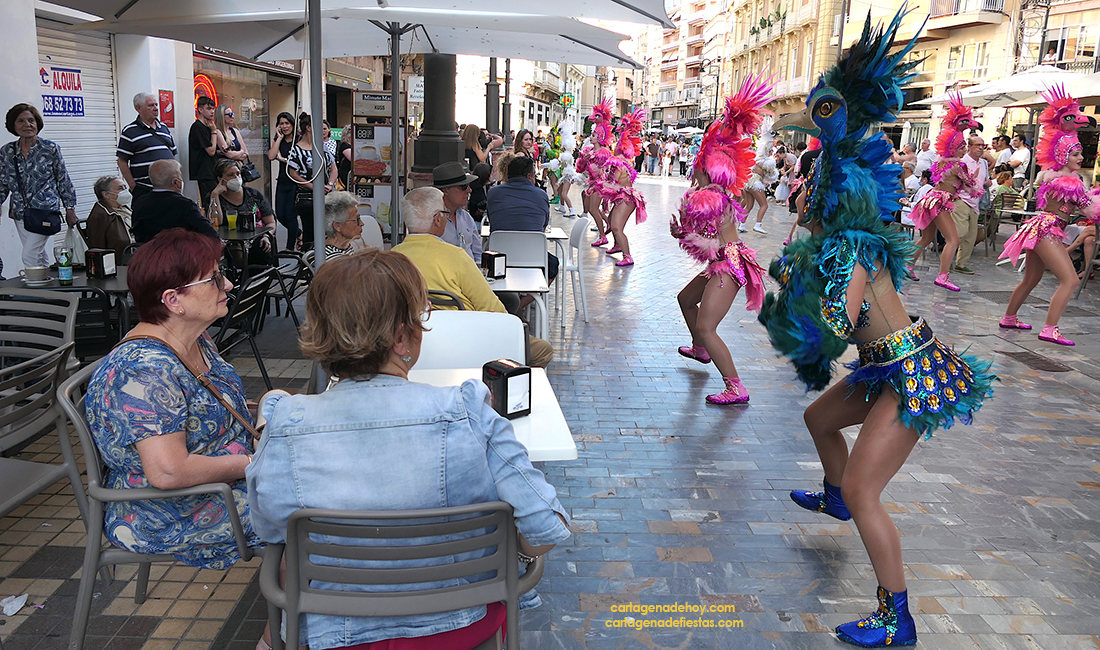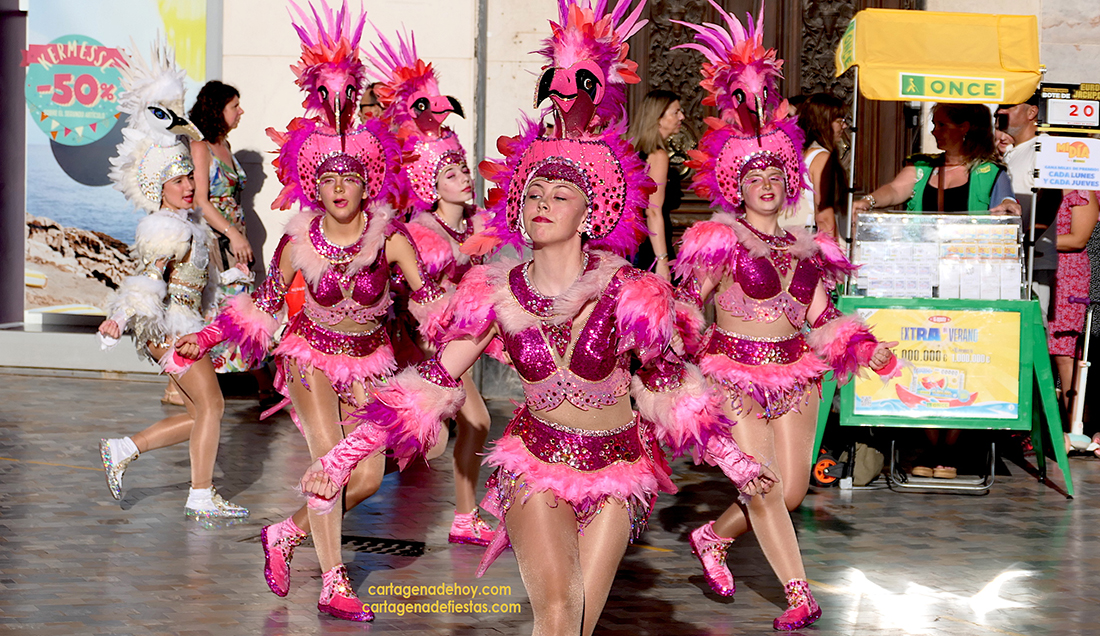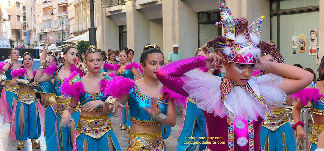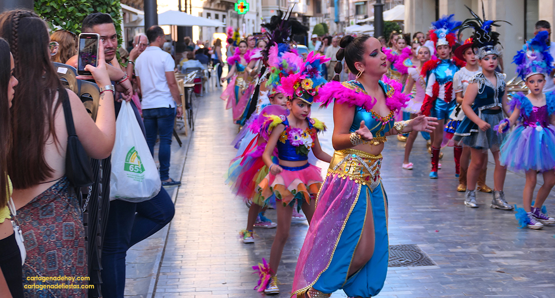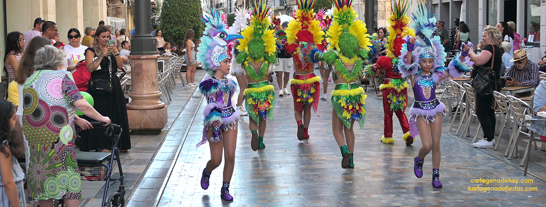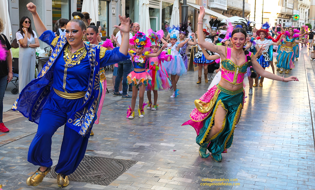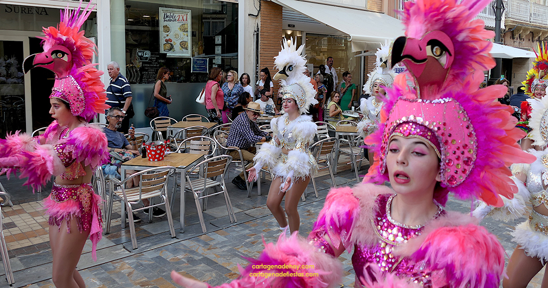 El pasacalles de la tarde de ayer de la fiestas carnavalera por el casco histórico de Cartagena tuvo como protagonistas a los animosos grupos coreográficos del Polígono Santa Ana y El Algar, respectivamente.