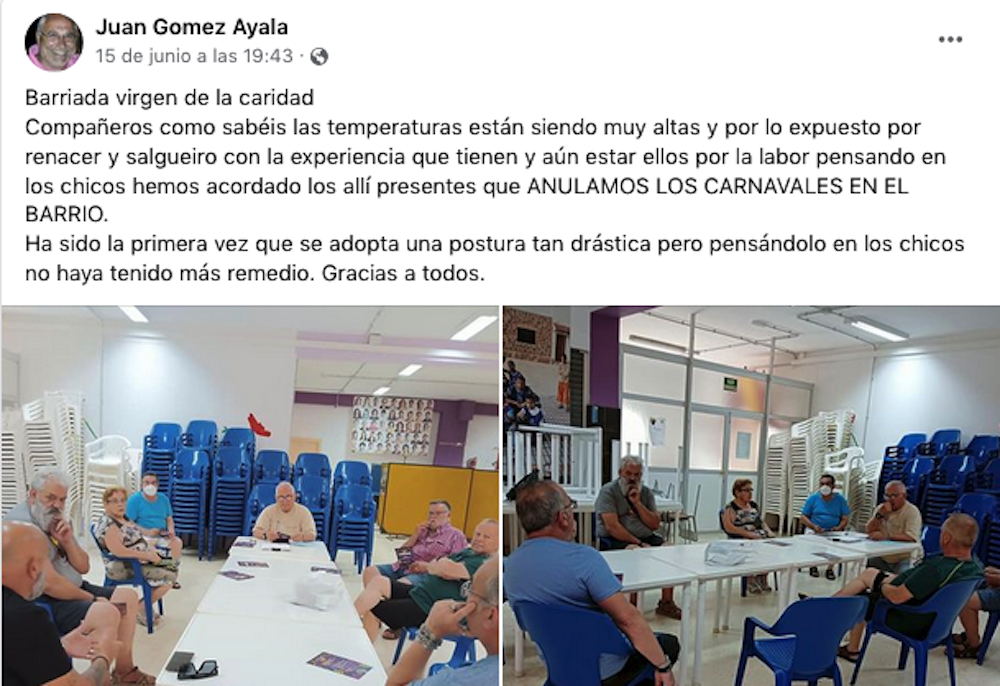 Los colectivos de la barriada organizadores de los tres días de fiesta carnavalera acordaron en una reunión suspender le programa previsto por las altas temperaturas de estos días.