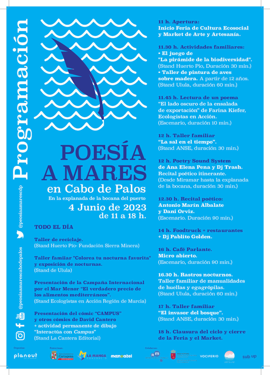 La sesión poética tendrá lugar este domingo, 'Día mundial del medio ambiente', de 11 a 18 horas, en la bocana del puerto. Participarán Dani Orviz, Antonio Marín Albalate, Ana Elena Pena y David Trashumante, además de la Feria de Asociaciones Ecologistas en defensa del litoral cartagenero y del Mar Menor, talleres y un mercadillo de artesanías.