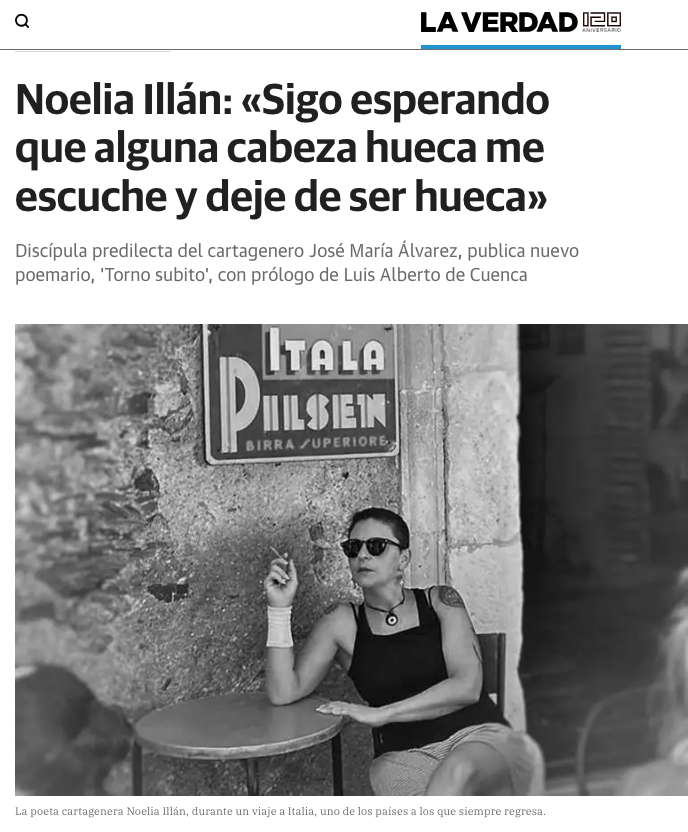 El prestigioso poeta y narrador elogia el poemario de la cartagenera Noelia Illán Conesa publicado recientemente por editorial Balduque dentro de su Colección Sudeste. "De impecable, limpia y afiladísima hechura formal (...) es verdaderamente fabuloso", ha escrito el ensayista británico afincado en España. El libro también ha motivado un amplio reportaje que el periodista Antonio Arco publicó ayer con la poeta dolorense en el diario La Verdad a nivel regional.