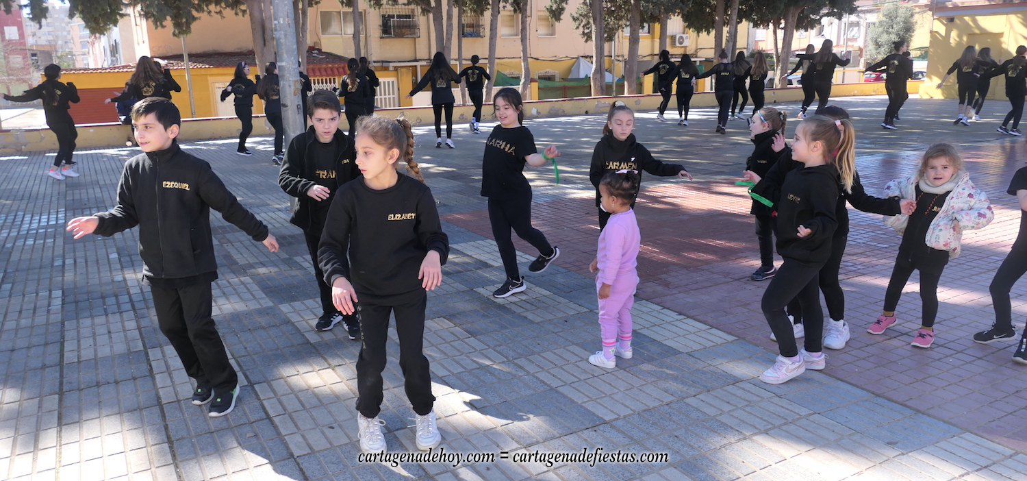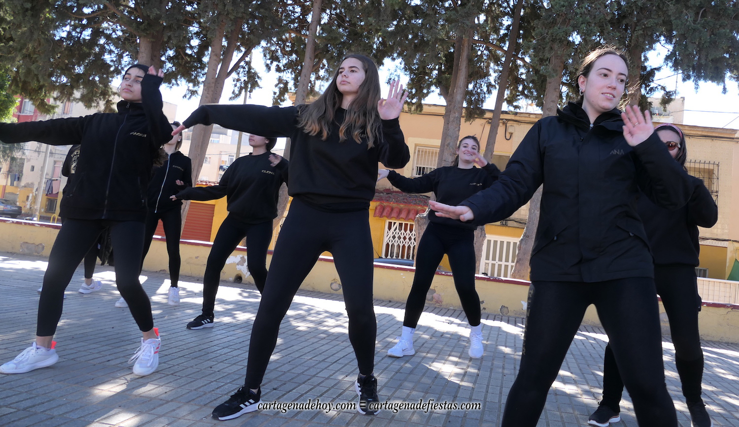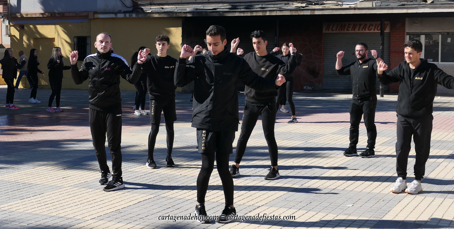 Durante la conversación, el grupo ensaya en la plaza Cronista Casal de la barriada Virgen de la Caridad, pues por la noche se desplazan a actuar en Los Alcázares en una escala más de este nuevo año, en el que, tras bailar en El Albujón en Navidad, también harán escalas en Aguilas, El Palmar, Torre Pacheco y en Cartagena, tanto en el gran carnaval que comienza el próximo día 10 como en otros eventos que vendrán. "Somos un grupo sin ánimo de lucro que nos gusta colaborar cuando nos llaman", explica Lorena Ortiz.