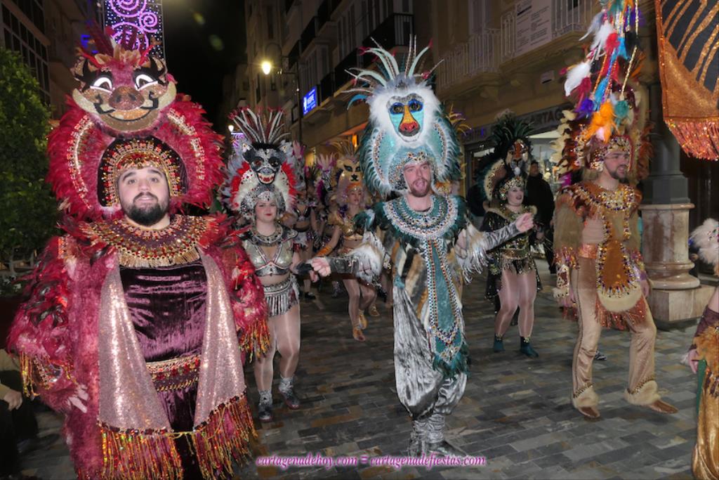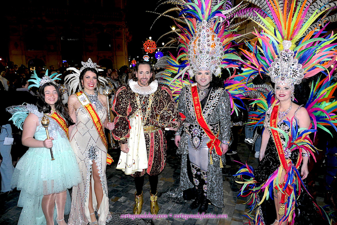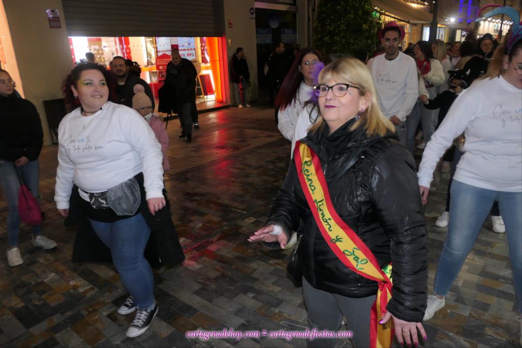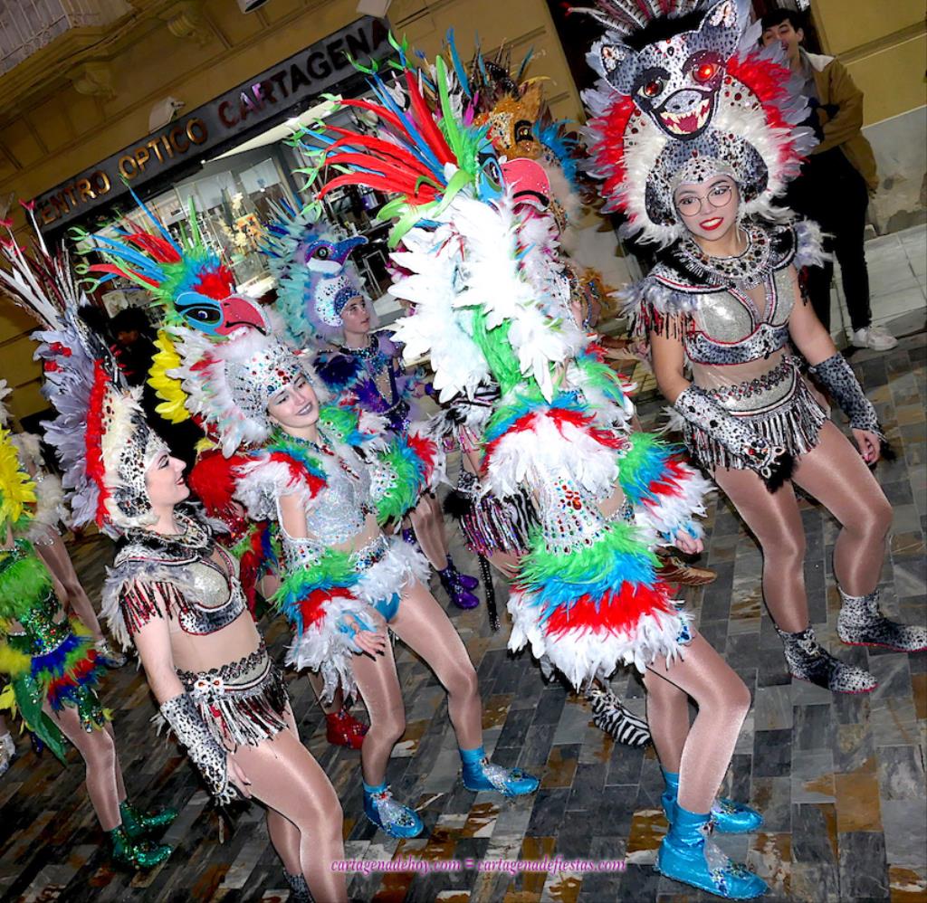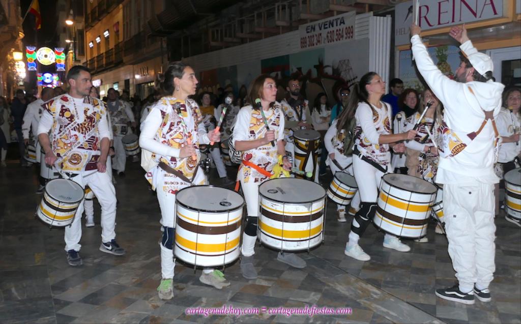 Con la gran batucada cartagenera D'Akokan en cabeza, el primer desfile del Carnaval de Cartagena 2023 ha cruzado la calle Santa Florentina para hacer una parada en la plaza del Icue, donde más tarde ha reanudado la marcha con los personajes de Don Carnal y Doña Cuaresma de 2022 en cabeza junto a las reinas adultas e infantil de la misma edición.