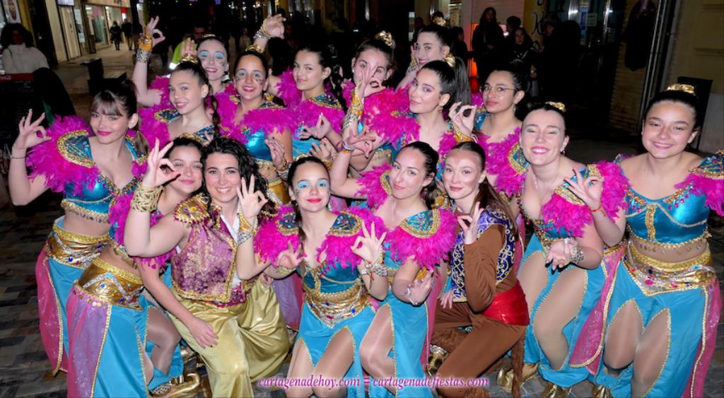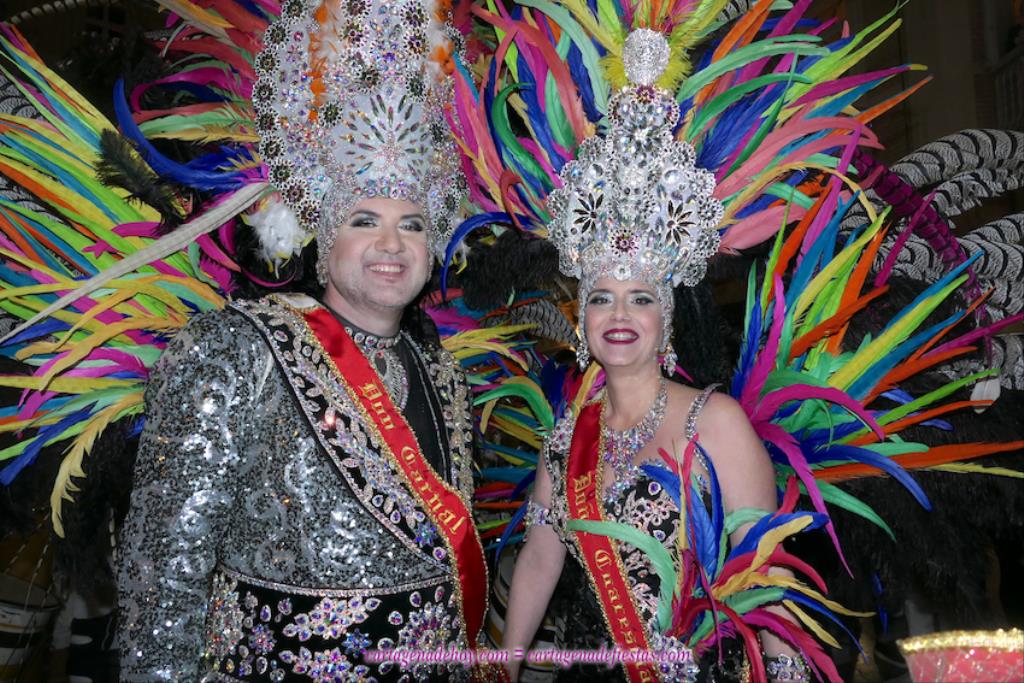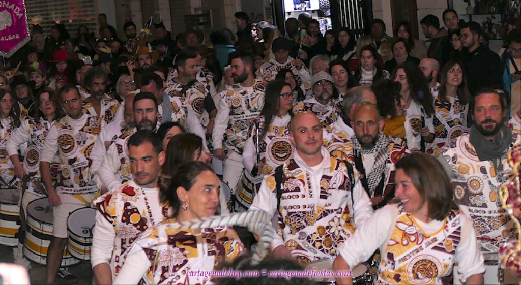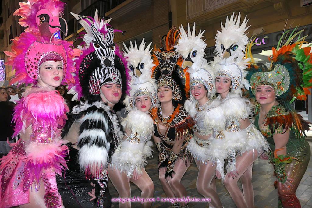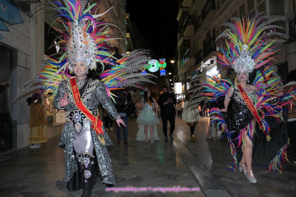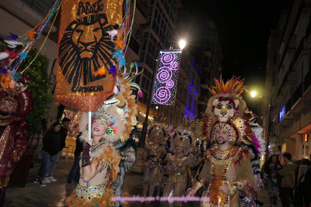 Con la gran batucada cartagenera D'Akokan en cabeza, el primer desfile del Carnaval de Cartagena 2023 ha cruzado la calle Santa Florentina para hacer una parada en la plaza del Icue, donde más tarde ha reanudado la marcha con los personajes de Don Carnal y Doña Cuaresma de 2022 en cabeza junto a las reinas adultas e infantil de la misma edición.