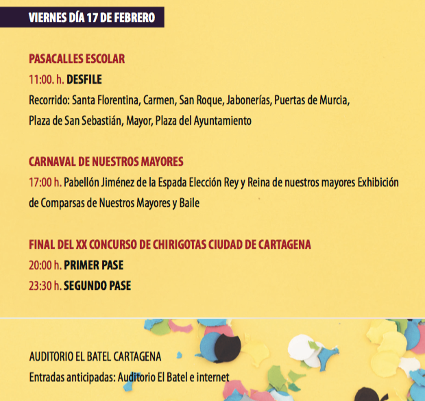El Carnaval de Cartagena fija tres focos de interés en la ciudad. Por la mañana, el regreso del carnaval infantil por las calles del centro histórico. Por la tarde, carnaval de los mayores dedicado a los cuentos en el pabellón Jiménez de la Espada. Por la noche, en dos pases, final del XX concurso de chirigotas 'Ciudad de Cartagena'.