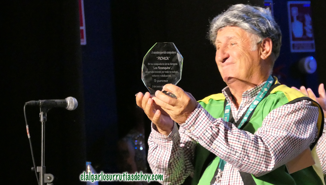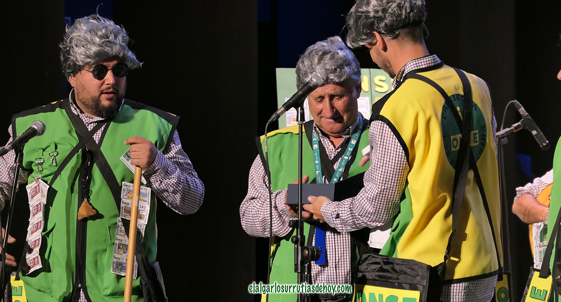 Los integrantes de la chirigota 'Los picoesquina' durante un momento de su actuación en el Teatro Apolo en la gala para ayudar a la AECC, rindieron su particular homenaje al componente de mayor edad del grupo por su "trabajo, esfuerzo y dedicación" hacia el colectivo carnavalero.