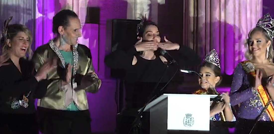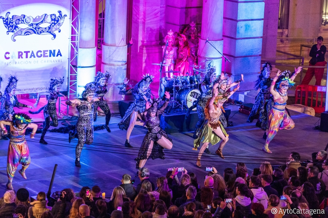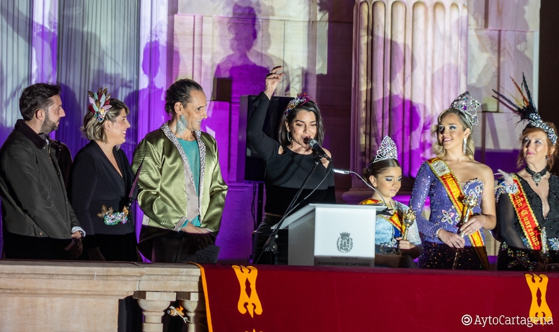 También alzó la voz por la Declaración de Interés Turístico Nacional de un carnaval “al que ahora le queda llenar de alegrías, sensualidad, bailes y vida a la calle todos los días hasta que tomemos las pelotas de Don Carnal y las tetillas de Doña Cuaresma”, remarcando que hay que darle “al cuerpo salero”, dentro de un texto en verso que le prepararon incitando a disfrutar de la fiesta. Concluyó con los vivas a Cartagena y a su carnaval. “¡Os amo cartageneros!”.