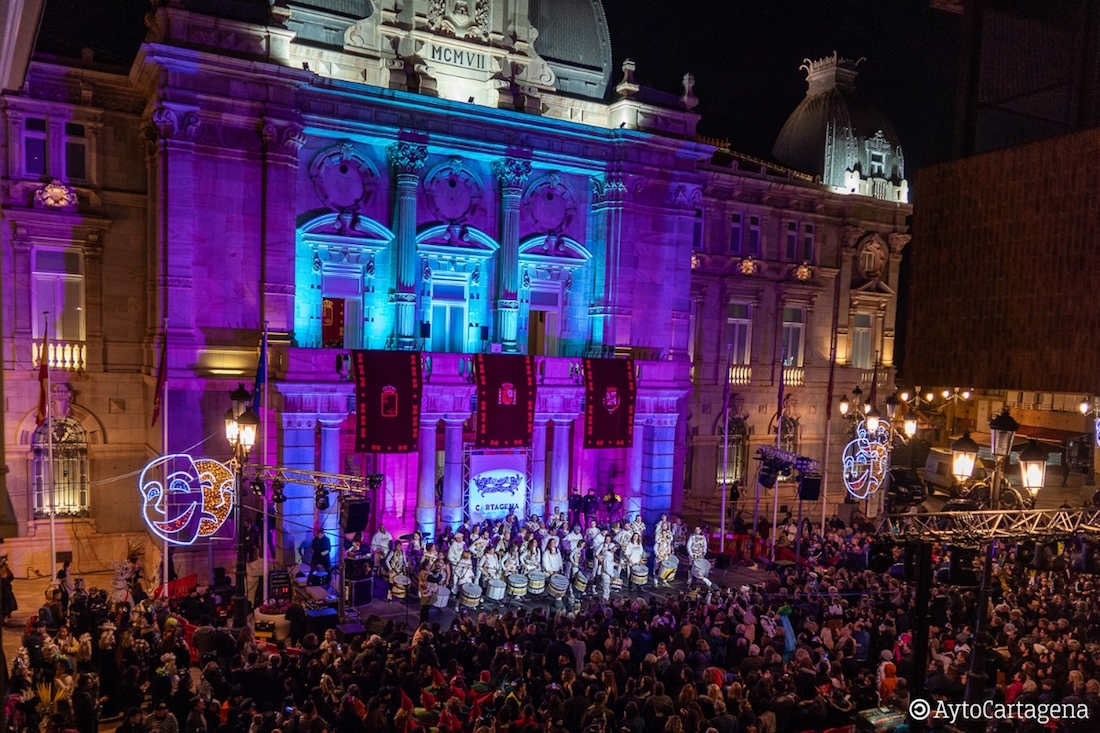 A las 22.35 horas comenzó, ante una plaza plagada de carnavaleros, el capítulo de alocuciones con el presidente de la Federación de Carnaval, Eduardo Pignatelli, quien pidió a los carnavales “haced mucho ruido. Cantar, bailar y disfrazaros para que el carnaval sea el motor de Cartagena y para que sepan que tenemos los mejores carnavales con una fiesta de primera fila”. También resaltó el esfuerzo de los carnavaleros e hizo una petición a la ciudadanía: “Acompañarnos, pues será la mejor recompensa a meses de esfuerzo”.
