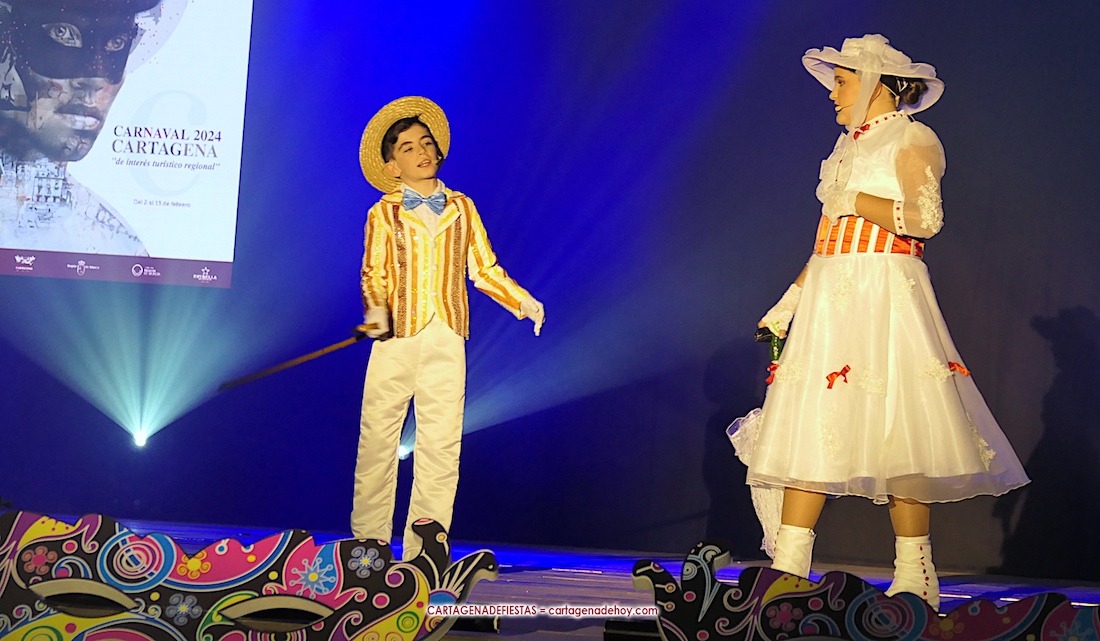 Si Don Carnal y Doña Cuaresma son hermanos en adultos, en la categoría infantil son primos Lucas Cegarra Sánchez y Elena Ortega Sánchez, integrantes de la comparsa Peché de El Llano del Beal, quienes se han estrenado esta tarde en el Carnaval de Cartagena, mostrándose un activos en su número sobre el escenario y participativos con el final del espectáculo de Mary Poppins.