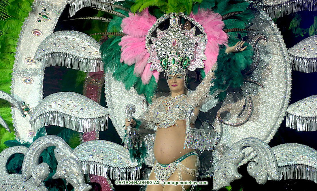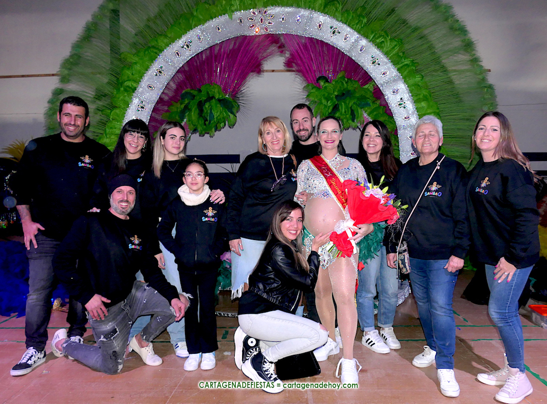 Laura Aznar Conesa es una apasionada del Carnaval que reside en La Vaguada y es gerente de la Heladería Rivareno, en la calle Puerta de Murcia de la ciudad 'trimilenaria' y el pasado año integró la nueva andadura de la comparsa Sambao, siendo la designada para presentarse al concurso de Reina del Carnaval de Cartagena'24. Lo que no sabía entonces es que lo haría con una muy evidente barriga en la que portaría a Pablo, quien vendrá al mundo dentro de algo más de un mes y que será su segundo hijo, quien llevará el nombre de Pablo. El primero es Francisco José, de 11 años de edad, fruto de su matrimonio con Pedro Sánchez, quien ha colaborado con la comparsa en preparar la gran cita de anoche.