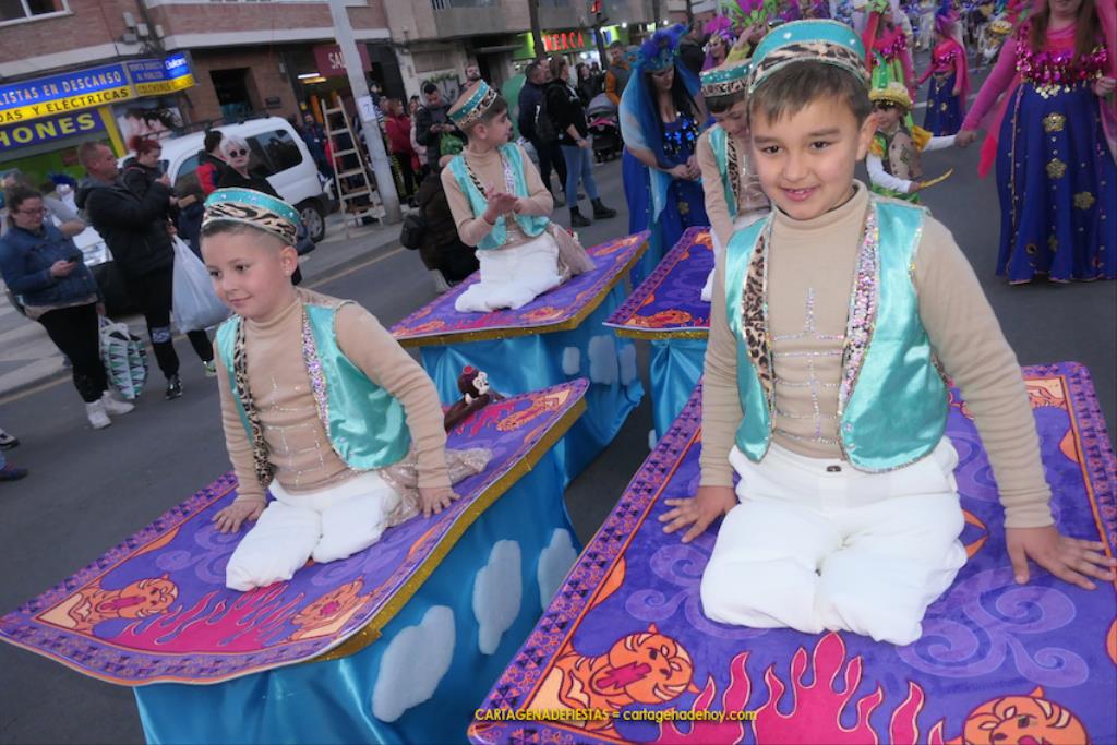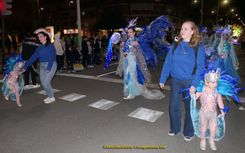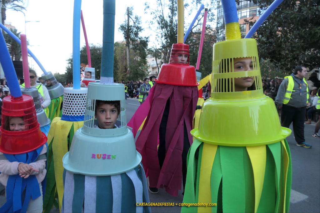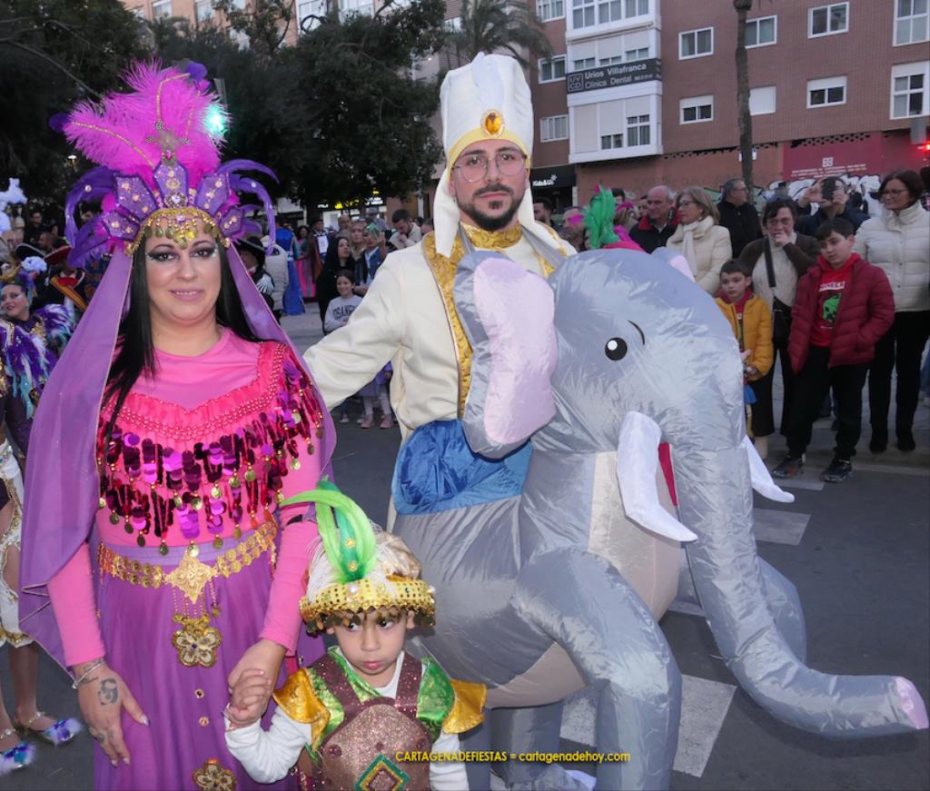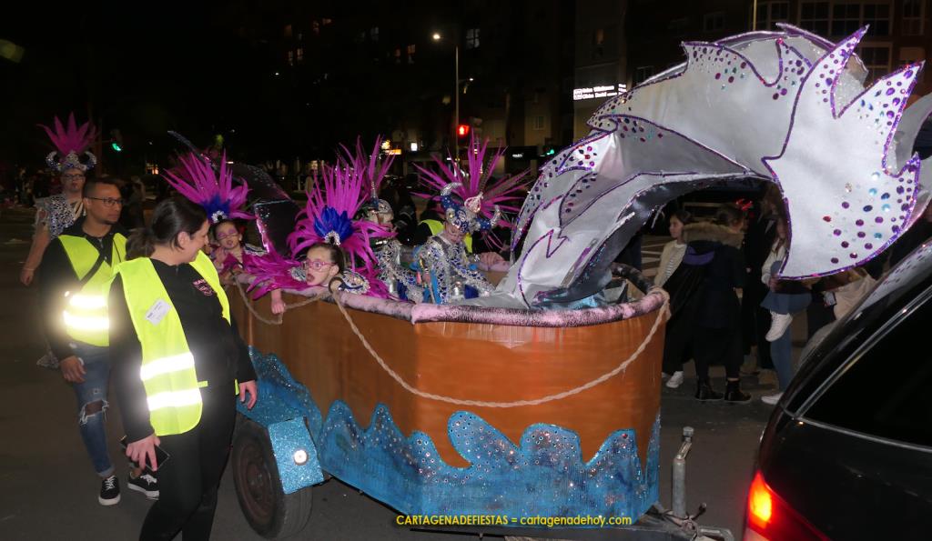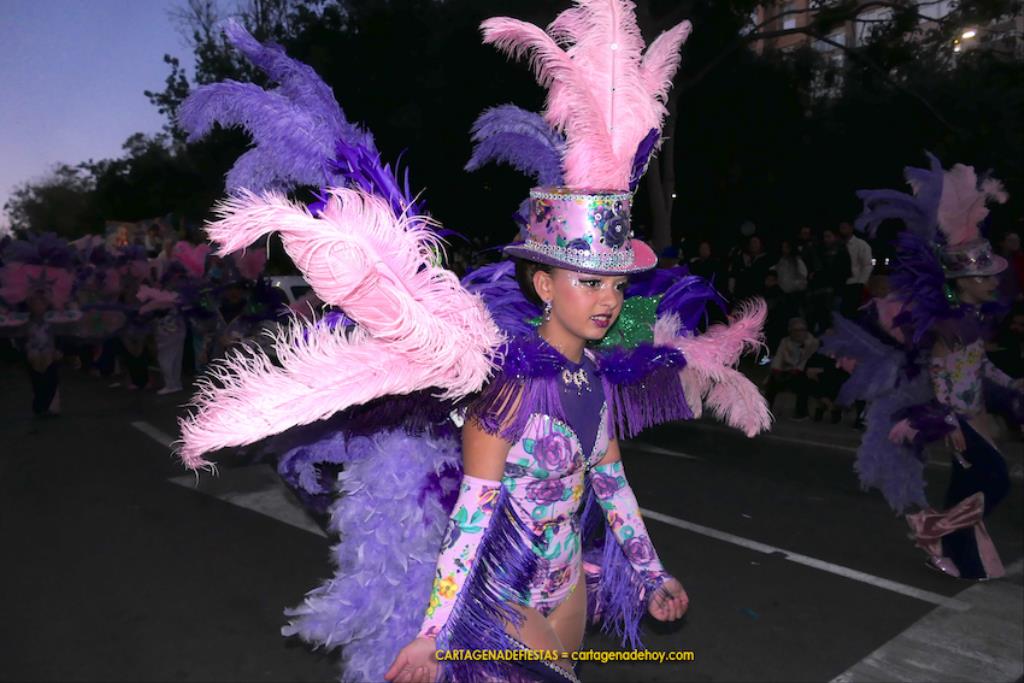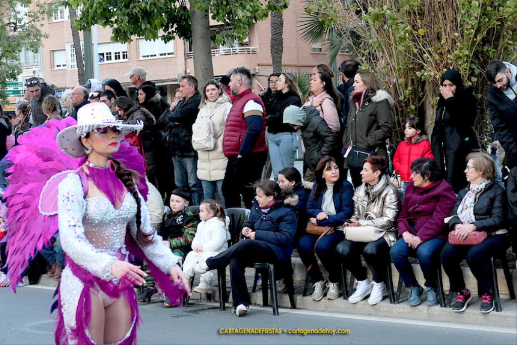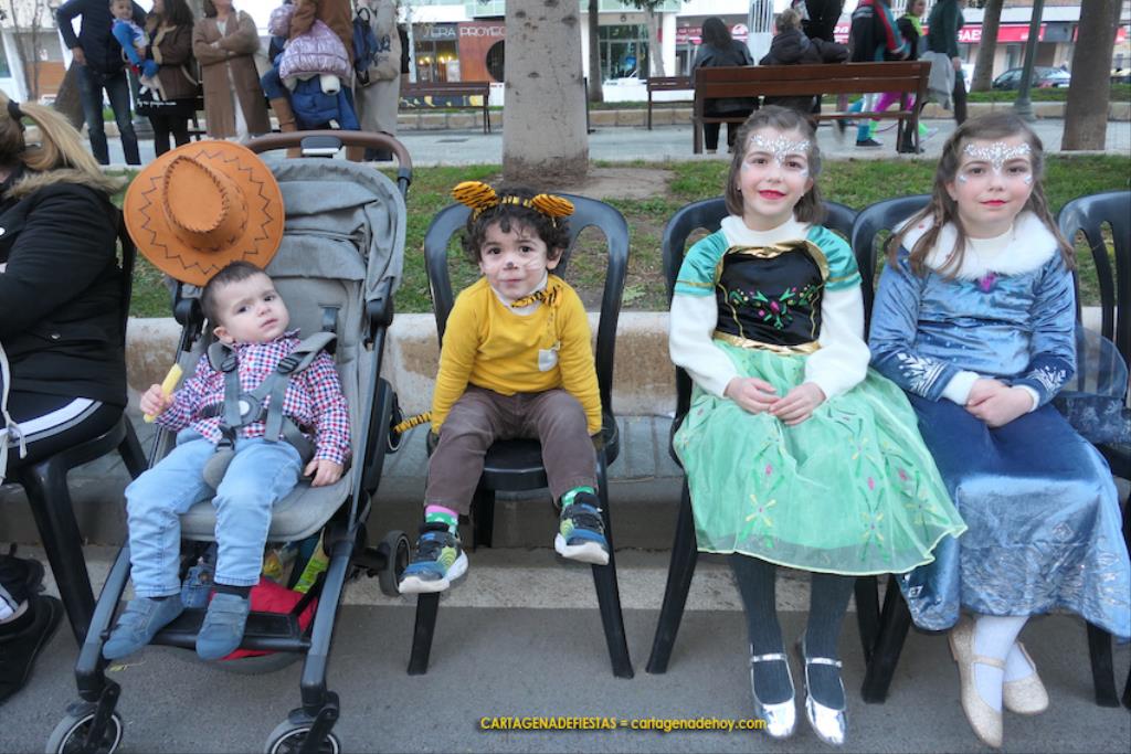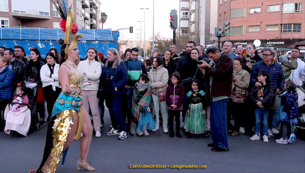 El desfile lo abrían colectivos no carnavaleros, pero habituales al desfile, como Viva Gym y los scout de Inhala Panzy de Canteras, dando paso a la carroza de la doble versión (adulta e infantil) de Don Carnal y Doña Cuaresma. A continuación las entrañables comparsas infantiles, donde muchos integrantes desmuestran ya sus ilusión por esta fiesta. Siguieron los mayores con variados disfraces, desde 'Barbie' hasta los protagonistas de 'Lo que el viento se llevó' (Barriada Virgen de la Caridad), cerrando la carroza con los reyes de este año, surgidos de La Manga.