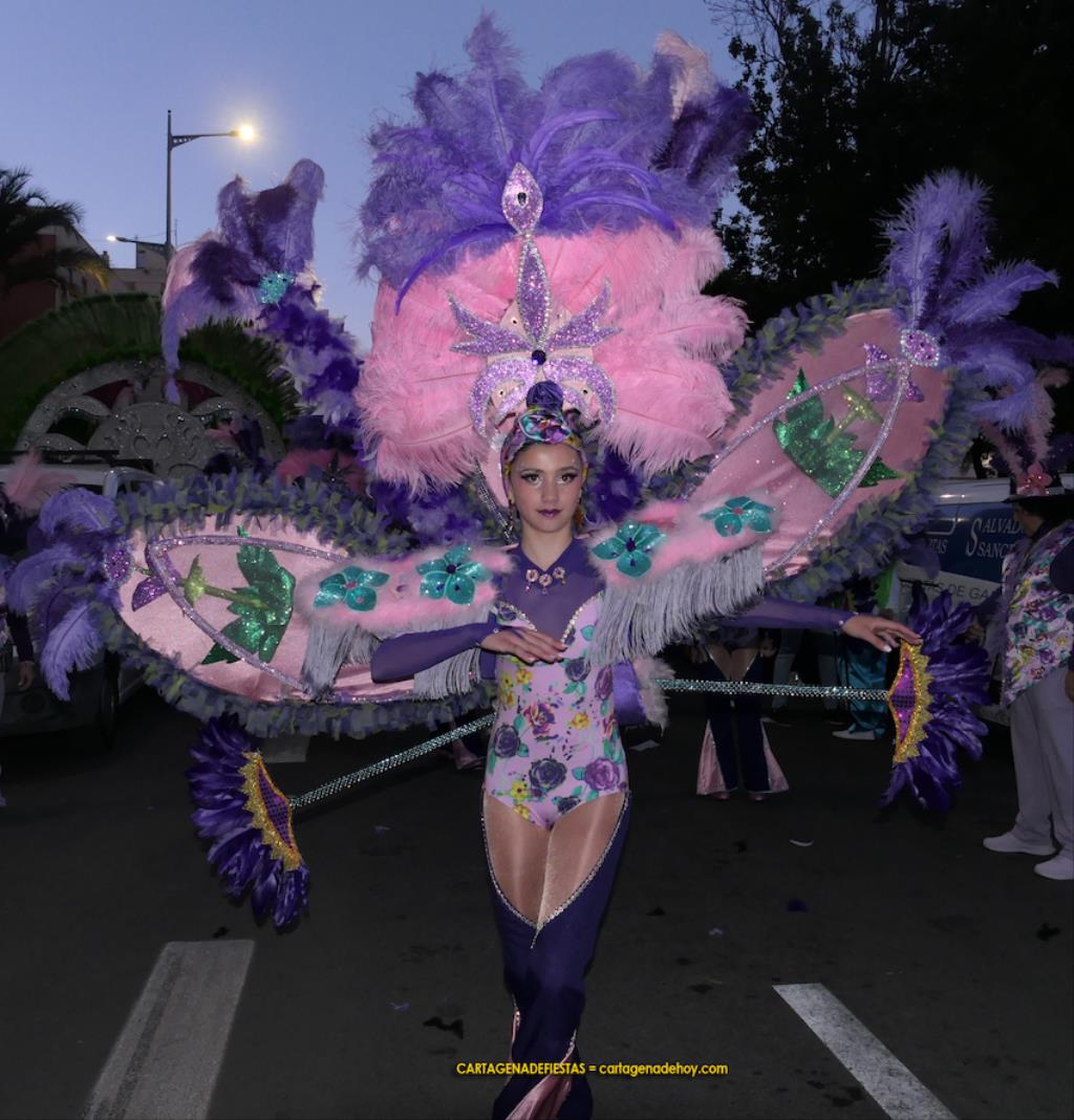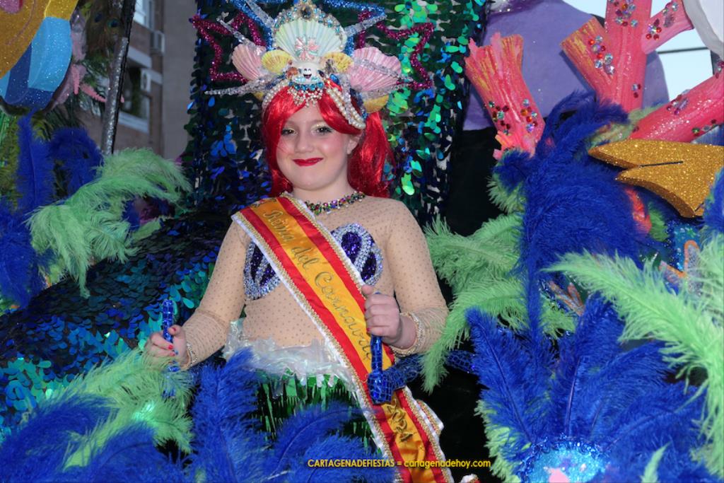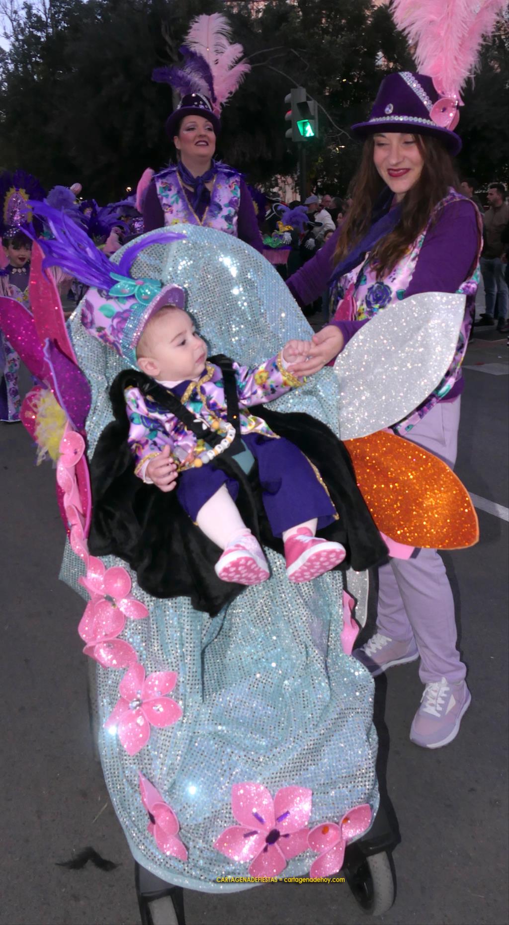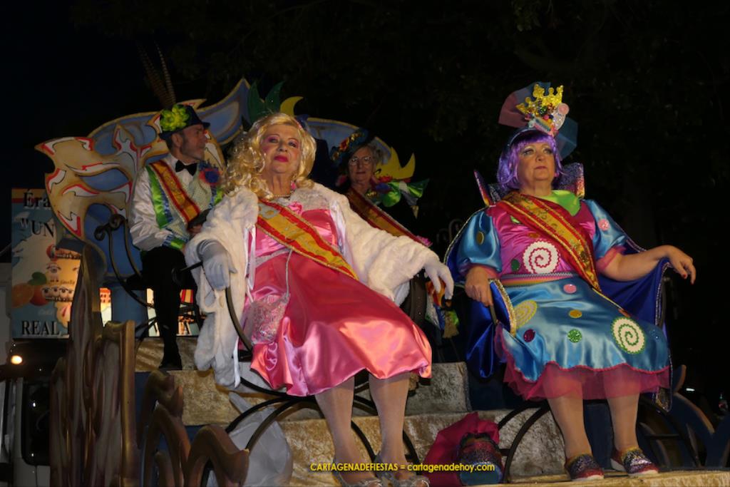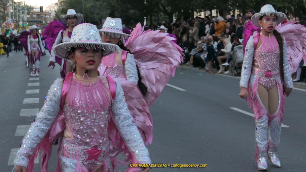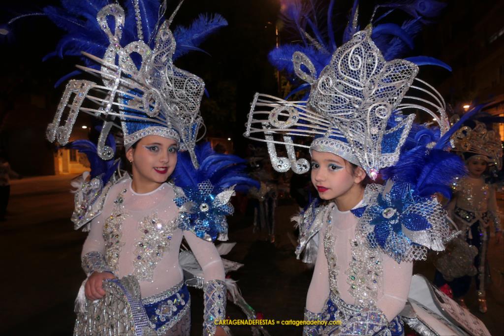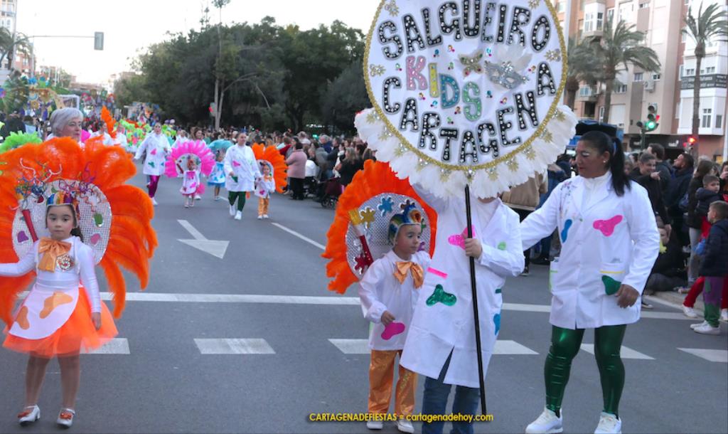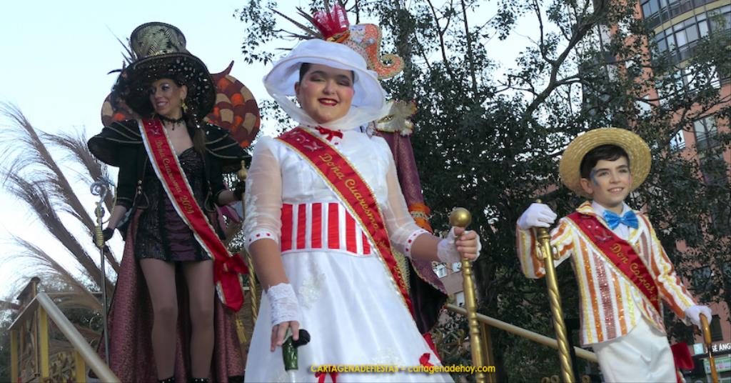 El desfile lo abrían colectivos no carnavaleros, pero habituales al desfile, como Viva Gym y los scout de Inhala Panzy de Canteras, dando paso a la carroza de la doble versión (adulta e infantil) de Don Carnal y Doña Cuaresma. A continuación las entrañables comparsas infantiles, donde muchos integrantes desmuestran ya sus ilusión por esta fiesta. Siguieron los mayores con variados disfraces, desde 'Barbie' hasta los protagonistas de 'Lo que el viento se llevó' (Barriada Virgen de la Caridad), cerrando la carroza con los reyes de este año, surgidos de La Manga.