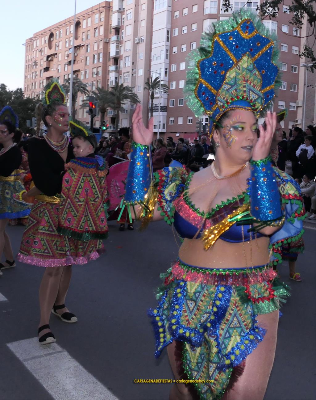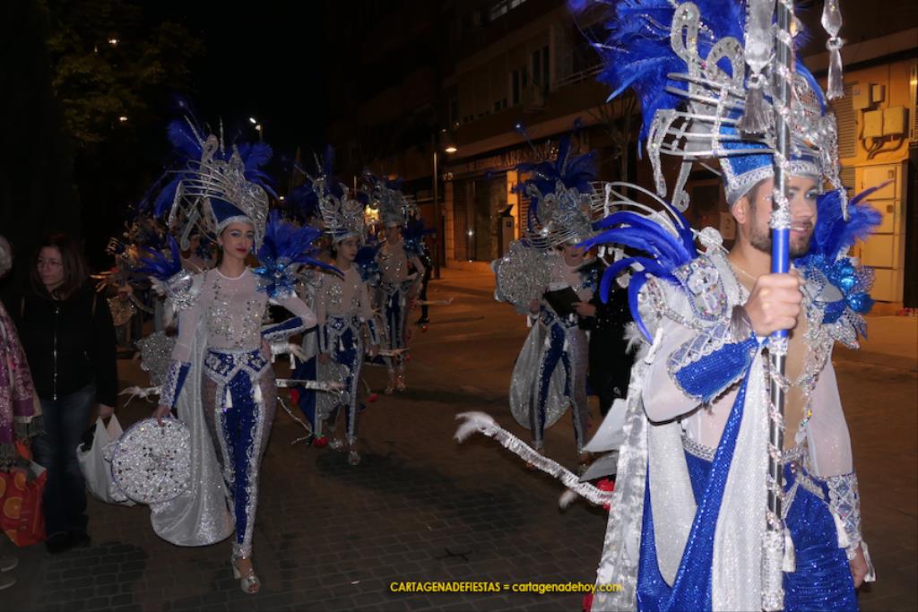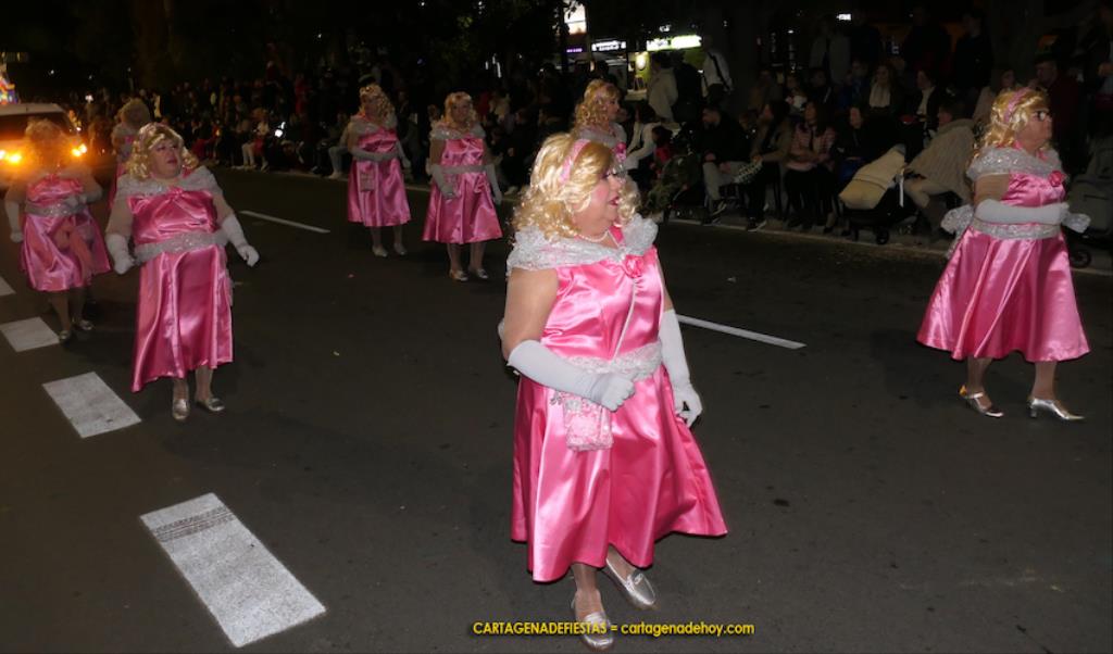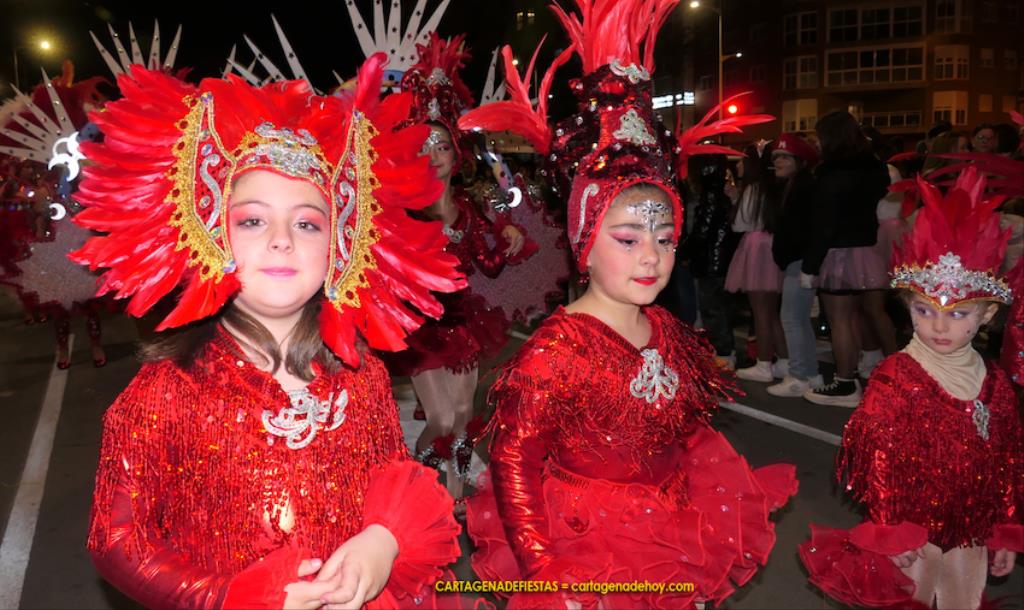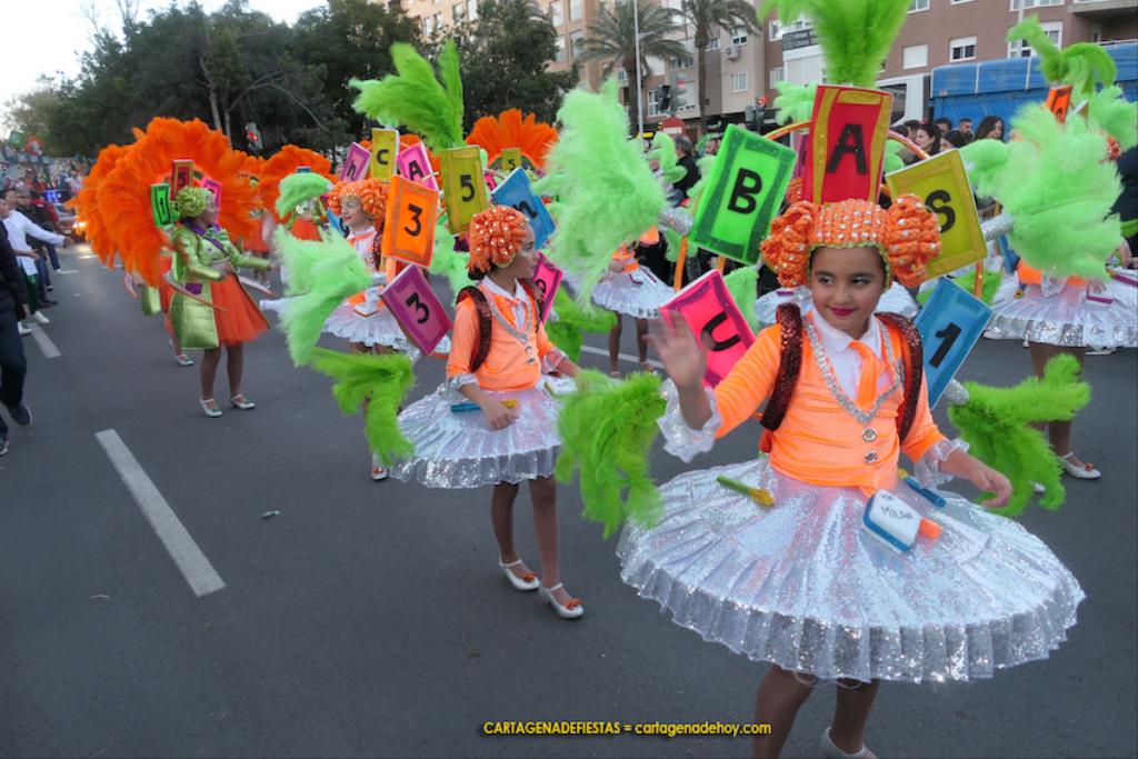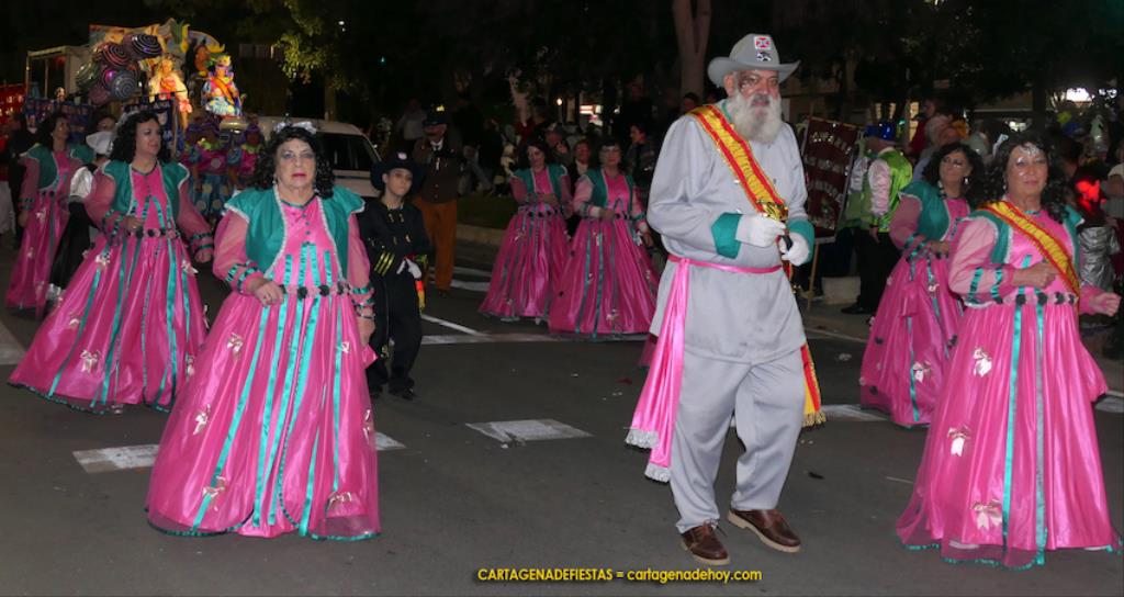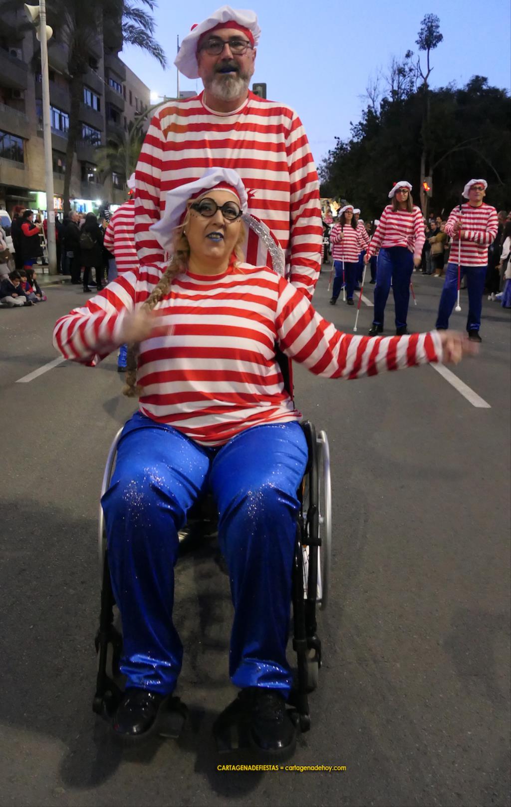 El desfile lo abrían colectivos no carnavaleros, pero habituales al desfile, como Viva Gym y los scout de Inhala Panzy de Canteras, dando paso a la carroza de la doble versión (adulta e infantil) de Don Carnal y Doña Cuaresma. A continuación las entrañables comparsas infantiles, donde muchos integrantes desmuestran ya sus ilusión por esta fiesta. Siguieron los mayores con variados disfraces, desde 'Barbie' hasta los protagonistas de 'Lo que el viento se llevó' (Barriada Virgen de la Caridad), cerrando la carroza con los reyes de este año, surgidos de La Manga.