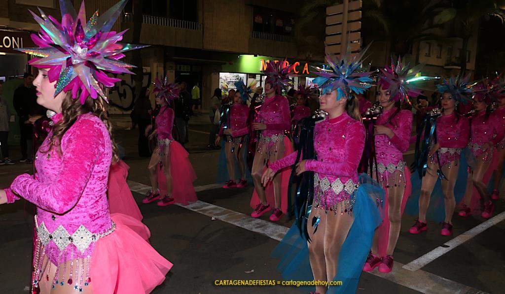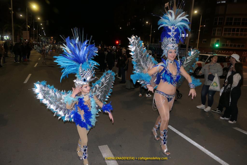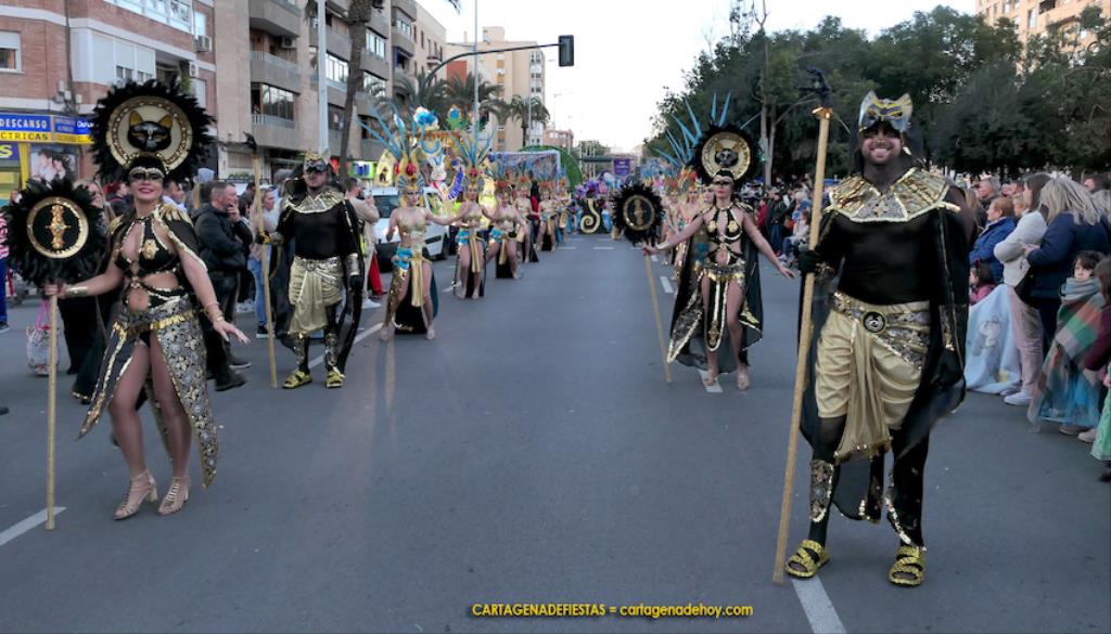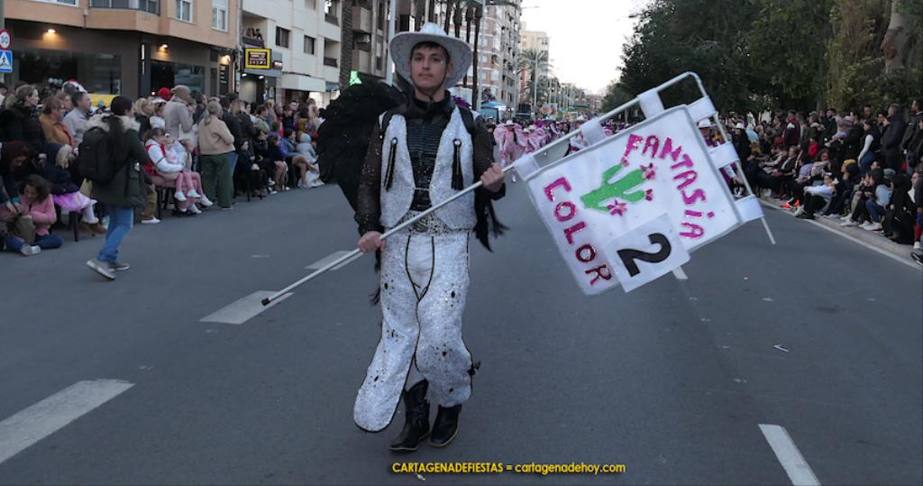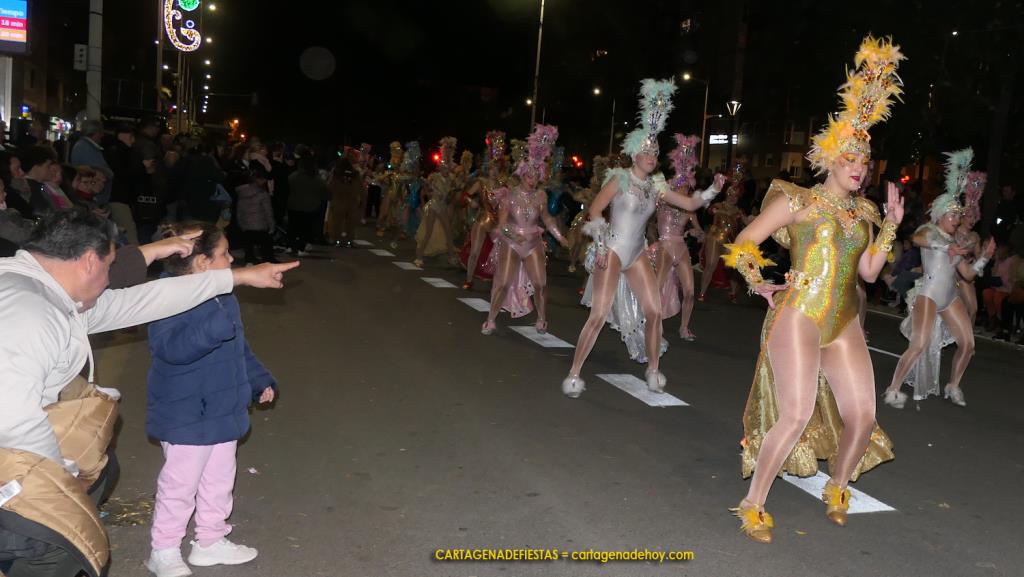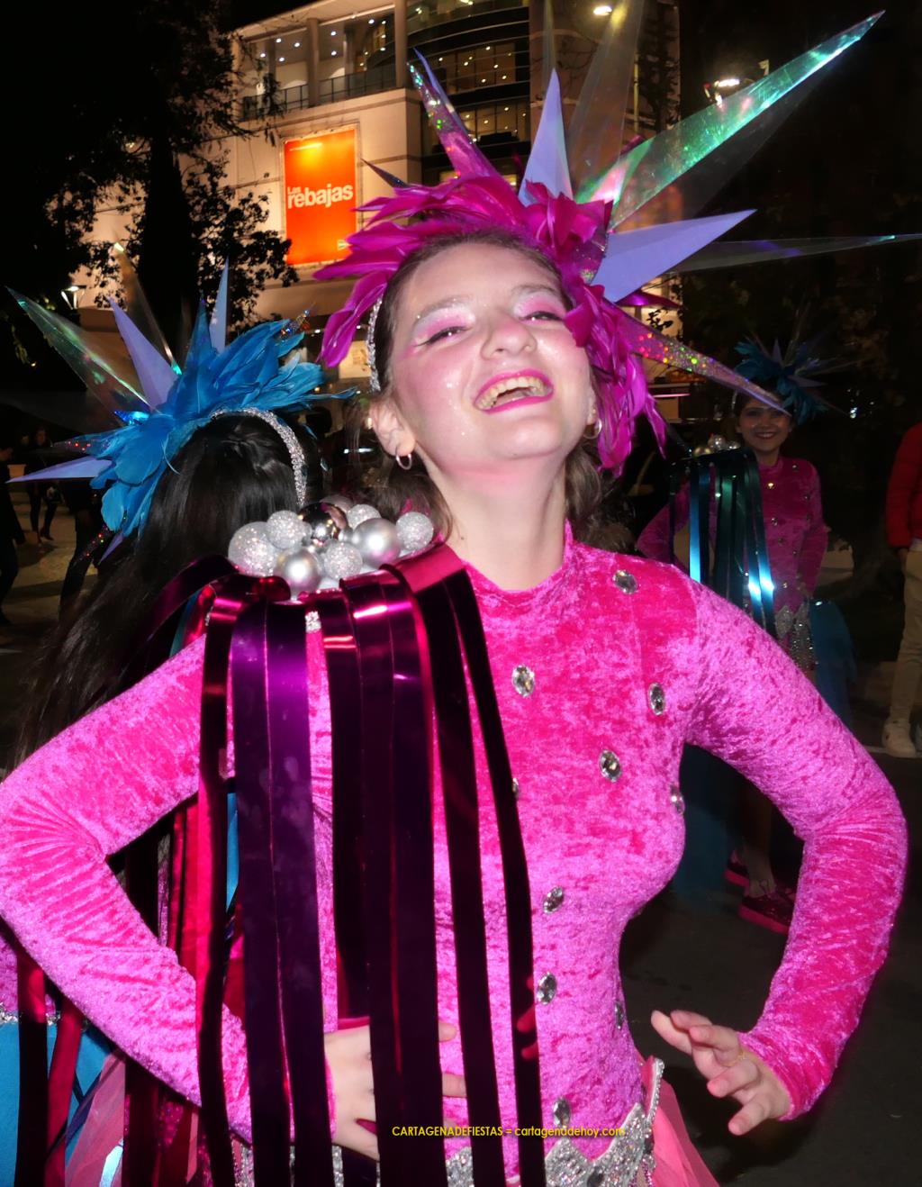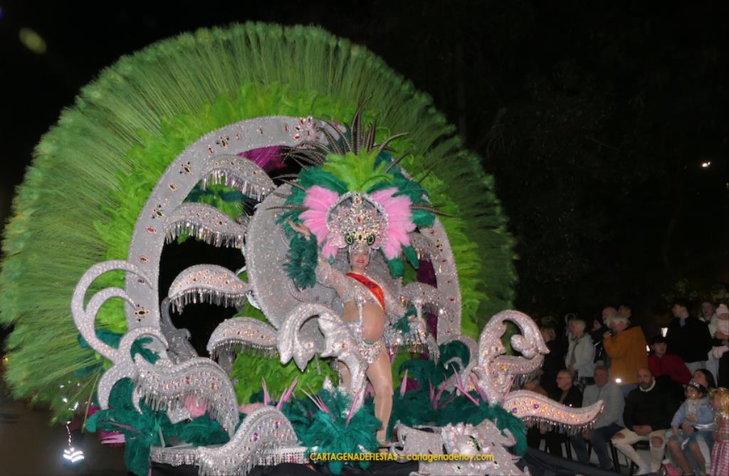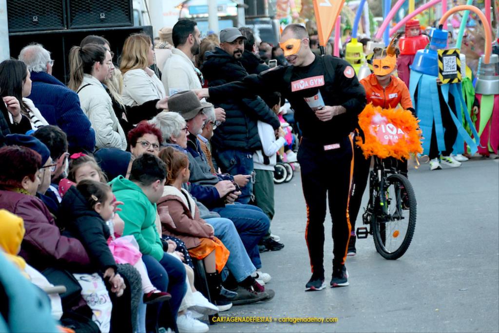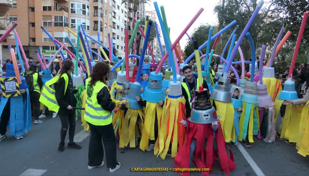 El desfile lo abrían colectivos no carnavaleros, pero habituales al desfile, como Viva Gym y los scout de Inhala Panzy de Canteras, dando paso a la carroza de la doble versión (adulta e infantil) de Don Carnal y Doña Cuaresma. A continuación las entrañables comparsas infantiles, donde muchos integrantes desmuestran ya sus ilusión por esta fiesta. Siguieron los mayores con variados disfraces, desde 'Barbie' hasta los protagonistas de 'Lo que el viento se llevó' (Barriada Virgen de la Caridad), cerrando la carroza con los reyes de este año, surgidos de La Manga.
