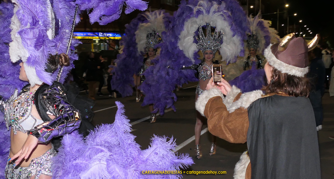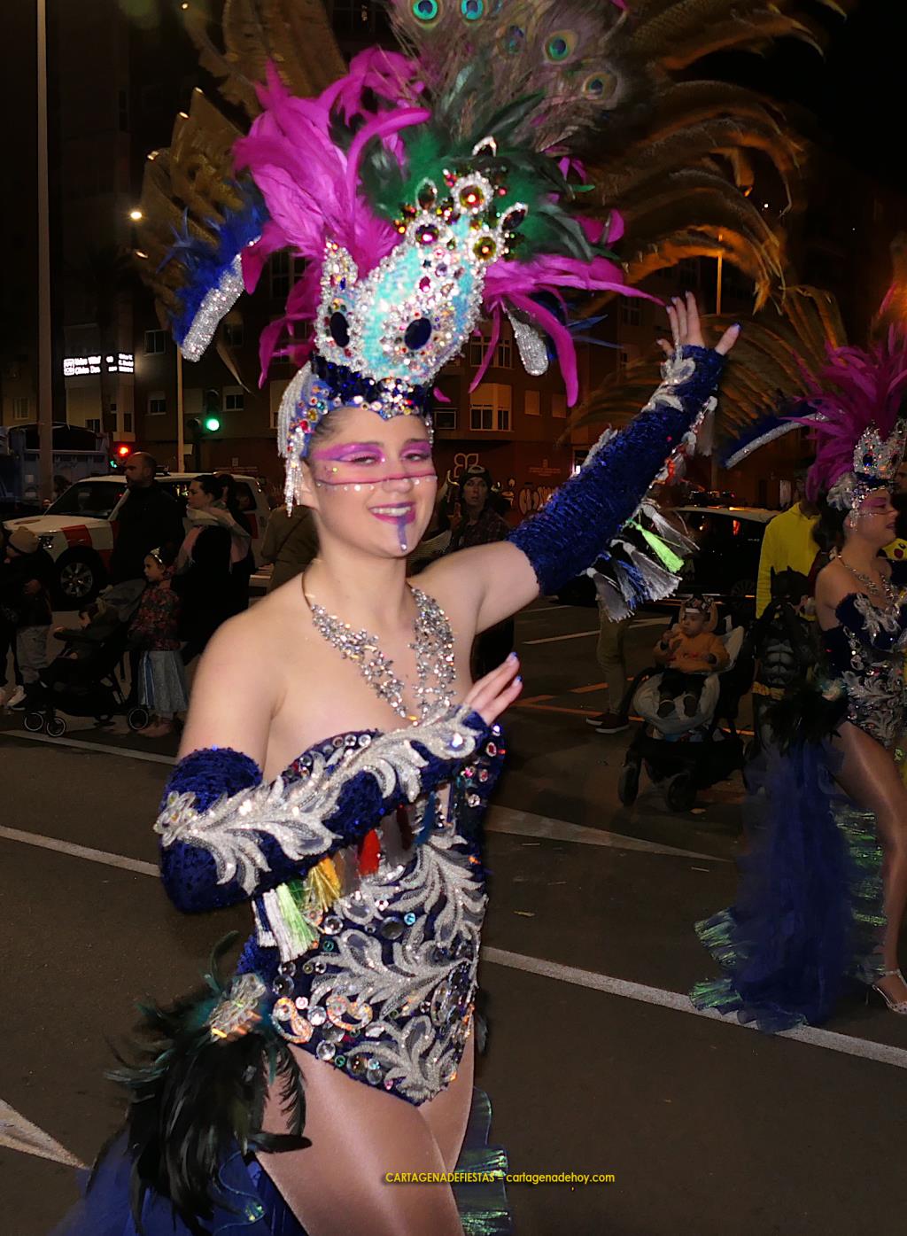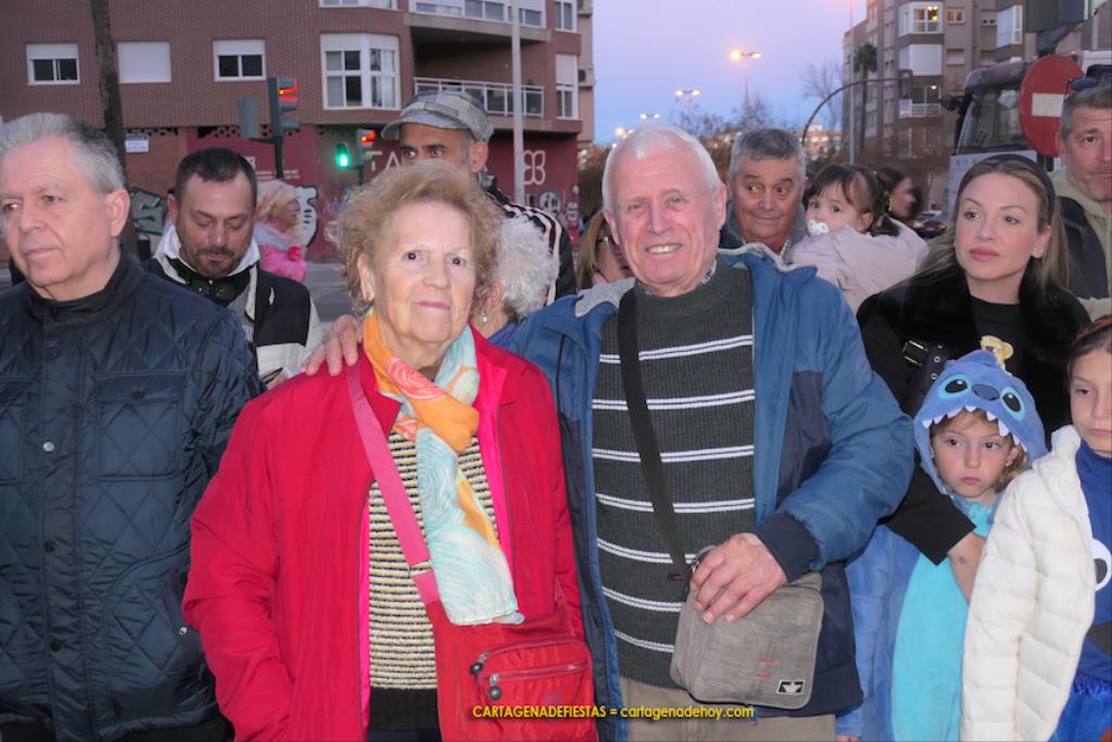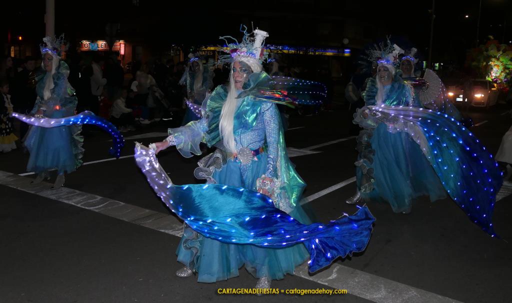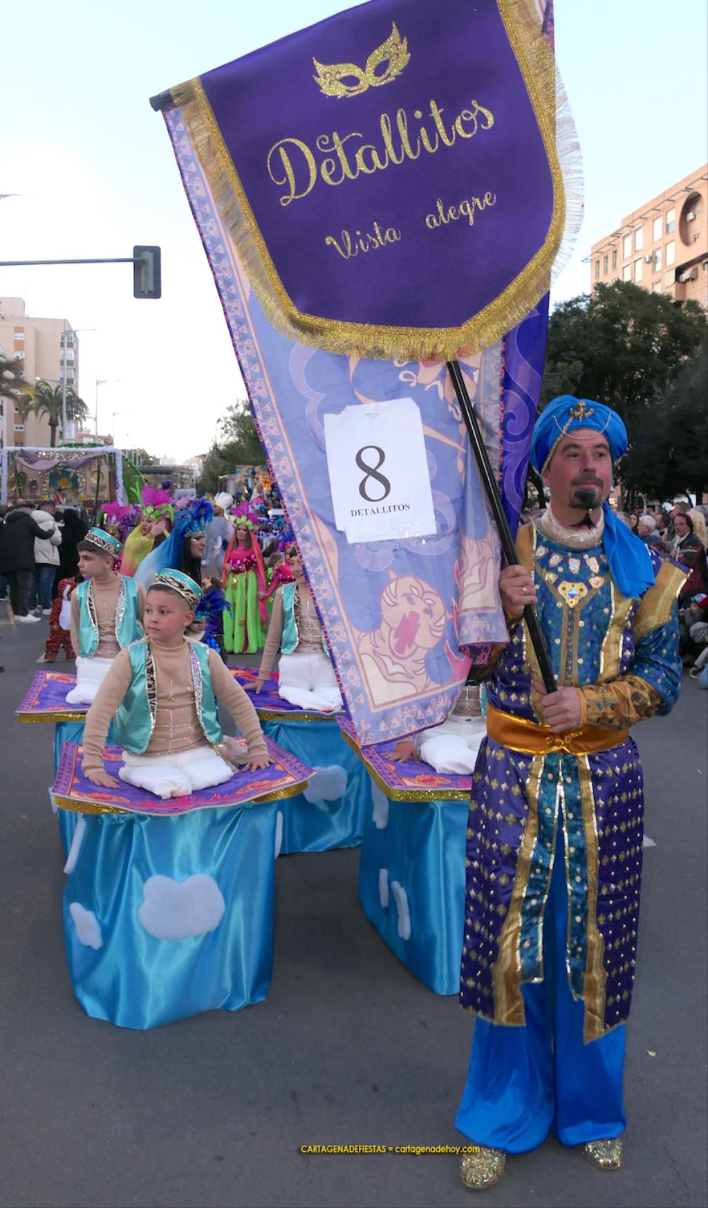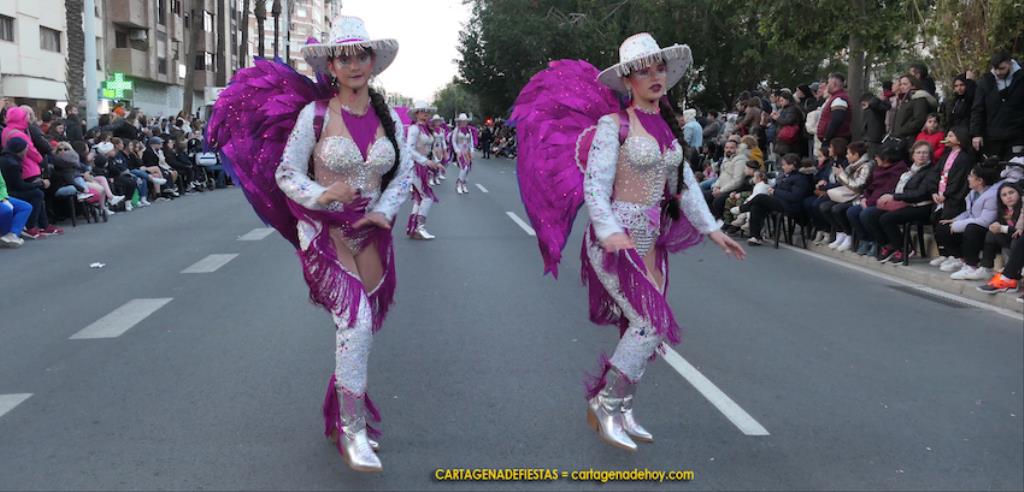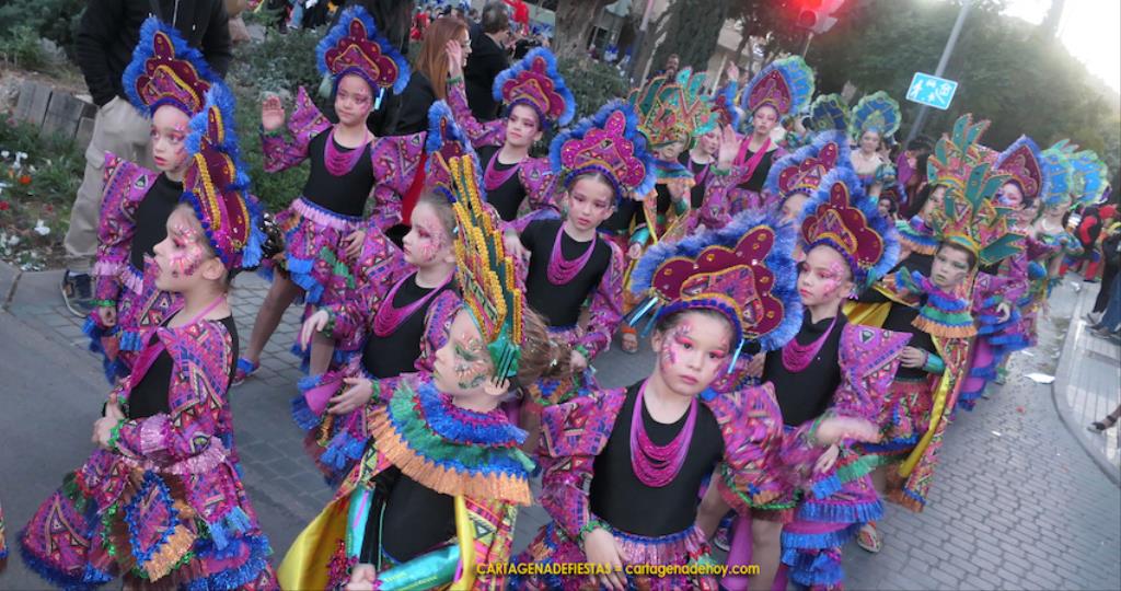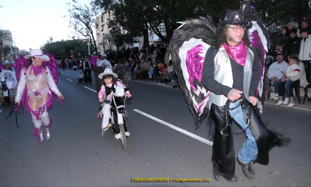 El desfile lo abrían colectivos no carnavaleros, pero habituales al desfile, como Viva Gym y los scout de Inhala Panzy de Canteras, dando paso a la carroza de la doble versión (adulta e infantil) de Don Carnal y Doña Cuaresma. A continuación las entrañables comparsas infantiles, donde muchos integrantes desmuestran ya sus ilusión por esta fiesta. Siguieron los mayores con variados disfraces, desde 'Barbie' hasta los protagonistas de 'Lo que el viento se llevó' (Barriada Virgen de la Caridad), cerrando la carroza con los reyes de este año, surgidos de La Manga.