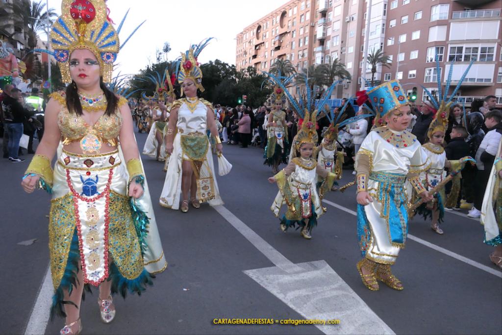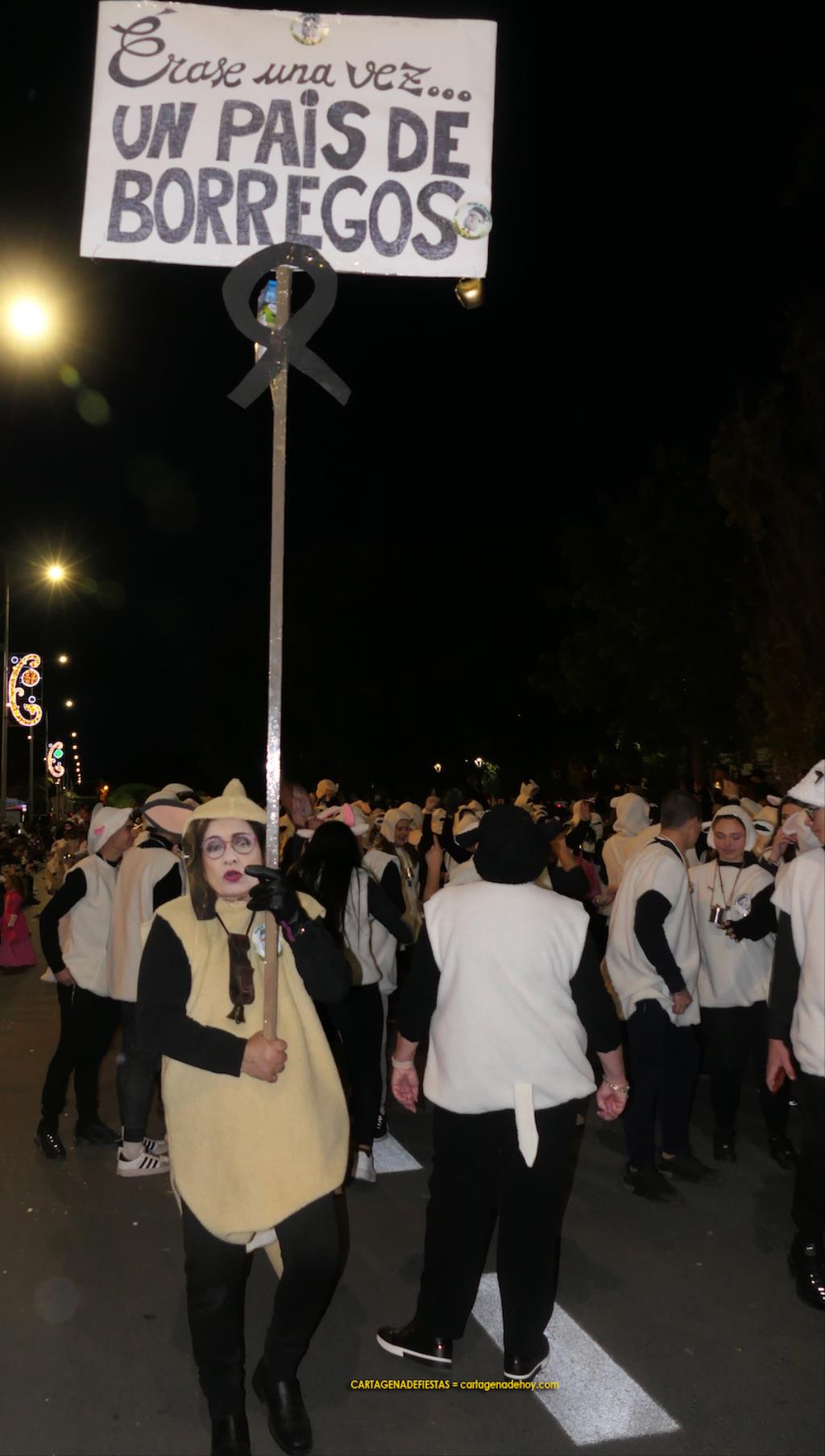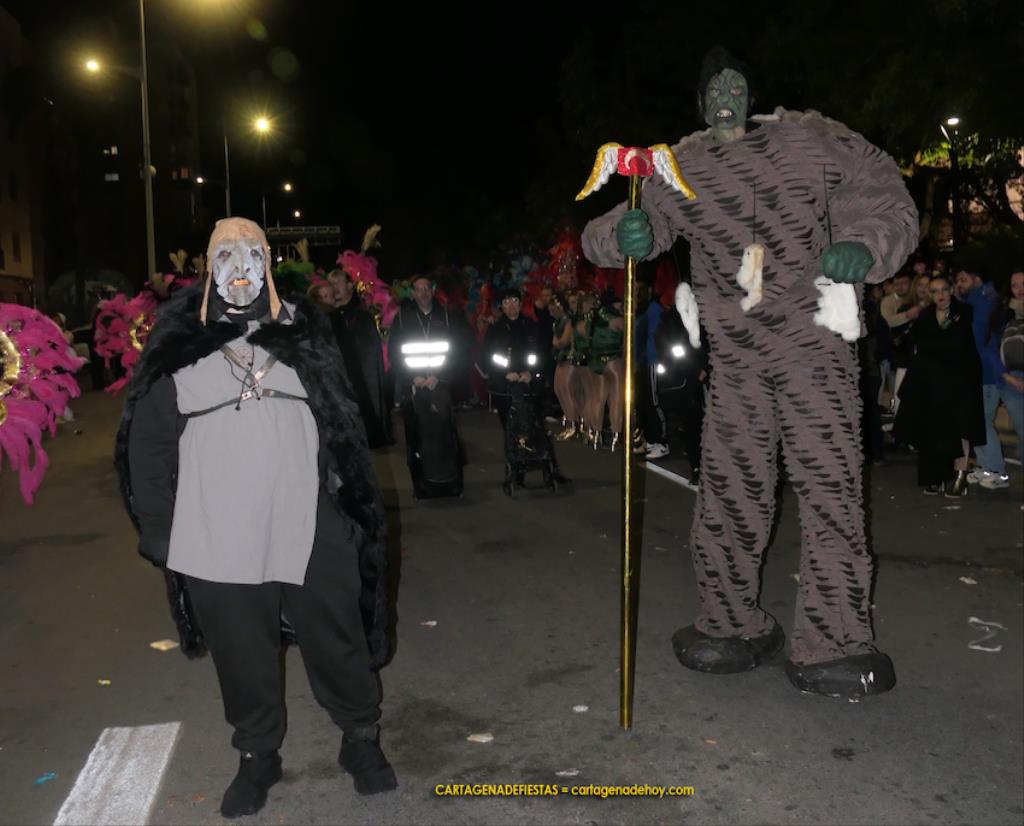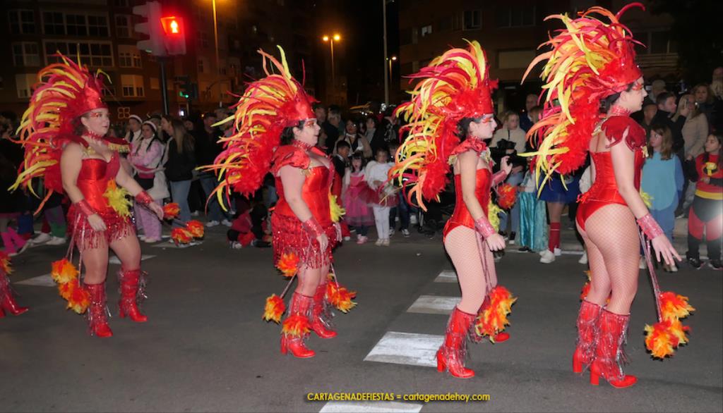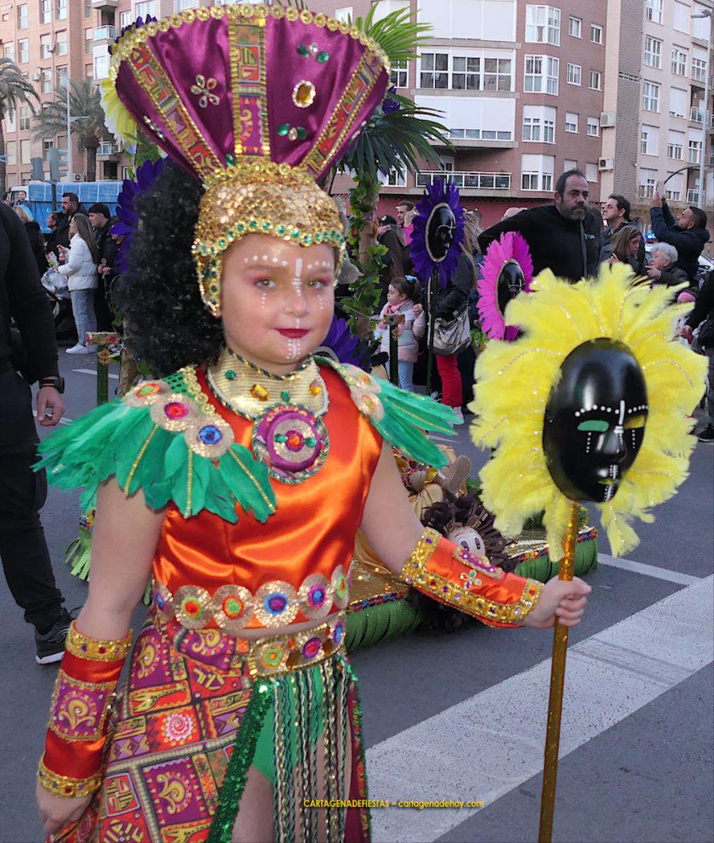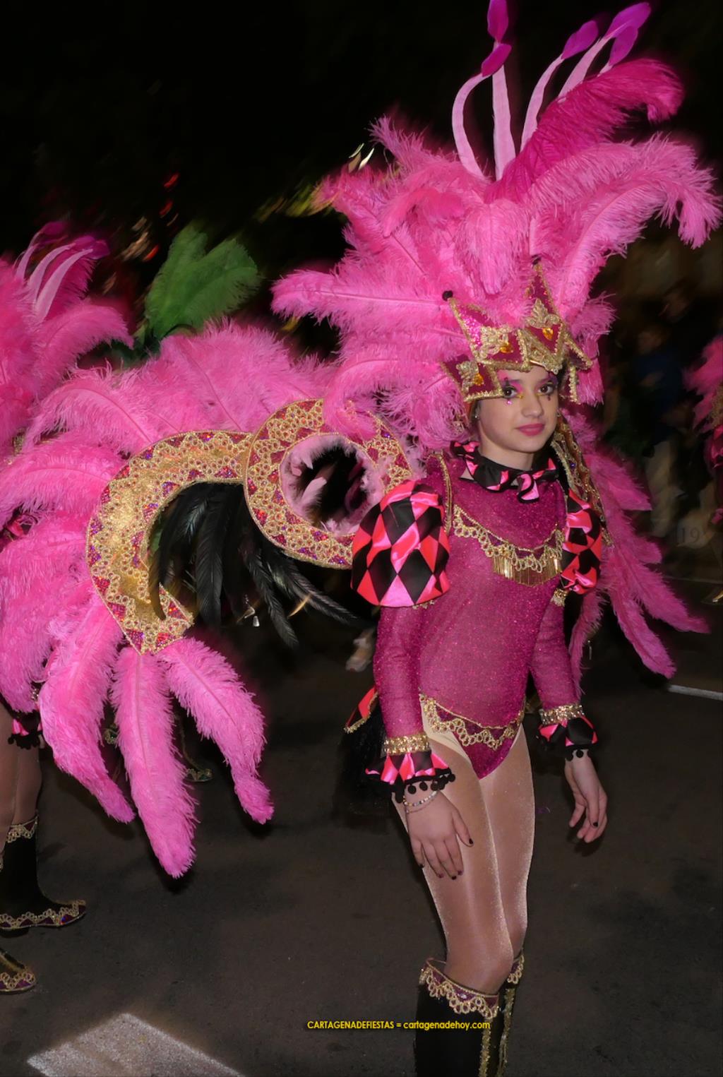 El desfile lo abrían colectivos no carnavaleros, pero habituales al desfile, como Viva Gym y los scout de Inhala Panzy de Canteras, dando paso a la carroza de la doble versión (adulta e infantil) de Don Carnal y Doña Cuaresma. A continuación las entrañables comparsas infantiles, donde muchos integrantes desmuestran ya sus ilusión por esta fiesta. Siguieron los mayores con variados disfraces, desde 'Barbie' hasta los protagonistas de 'Lo que el viento se llevó' (Barriada Virgen de la Caridad), cerrando la carroza con los reyes de este año, surgidos de La Manga.