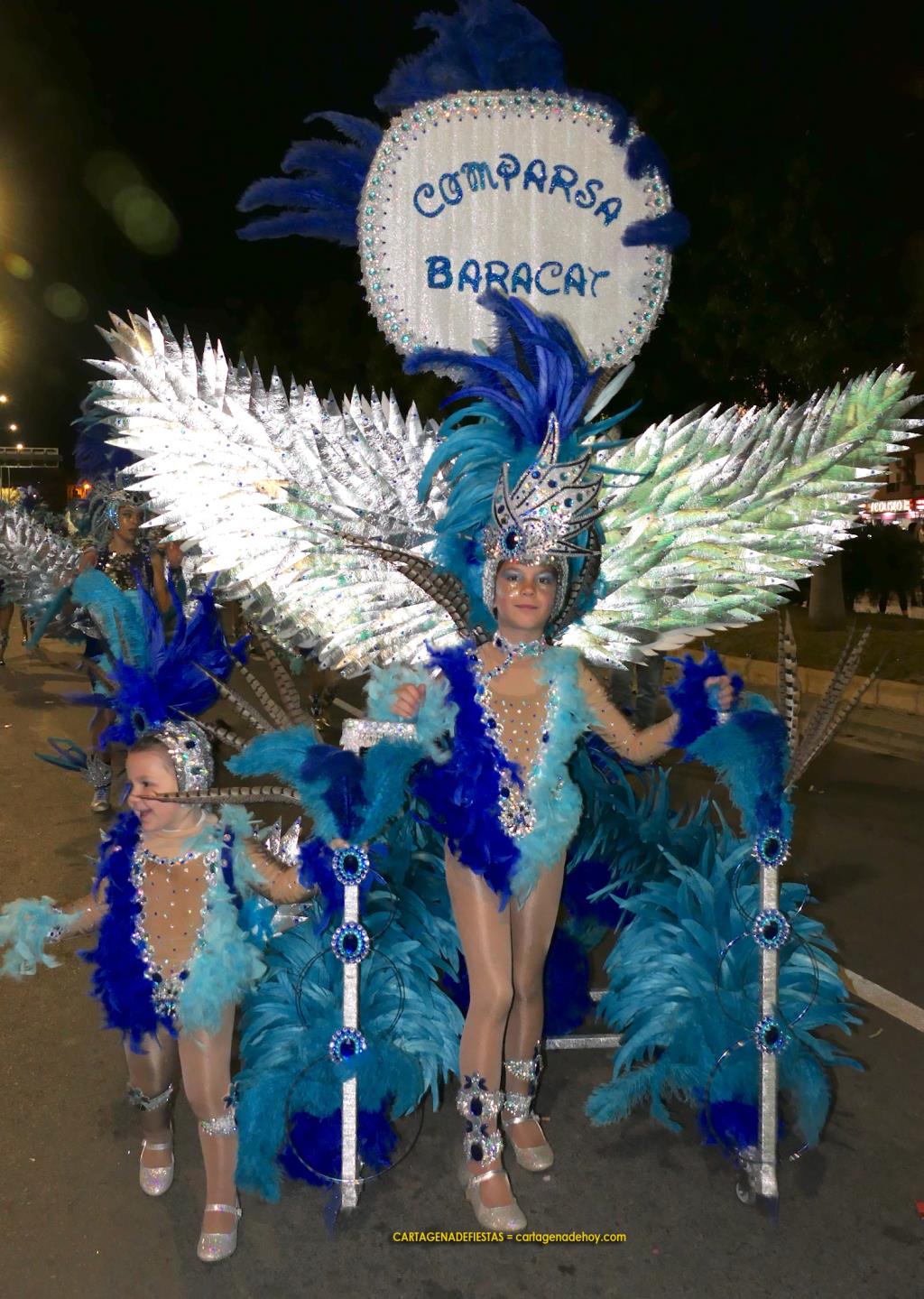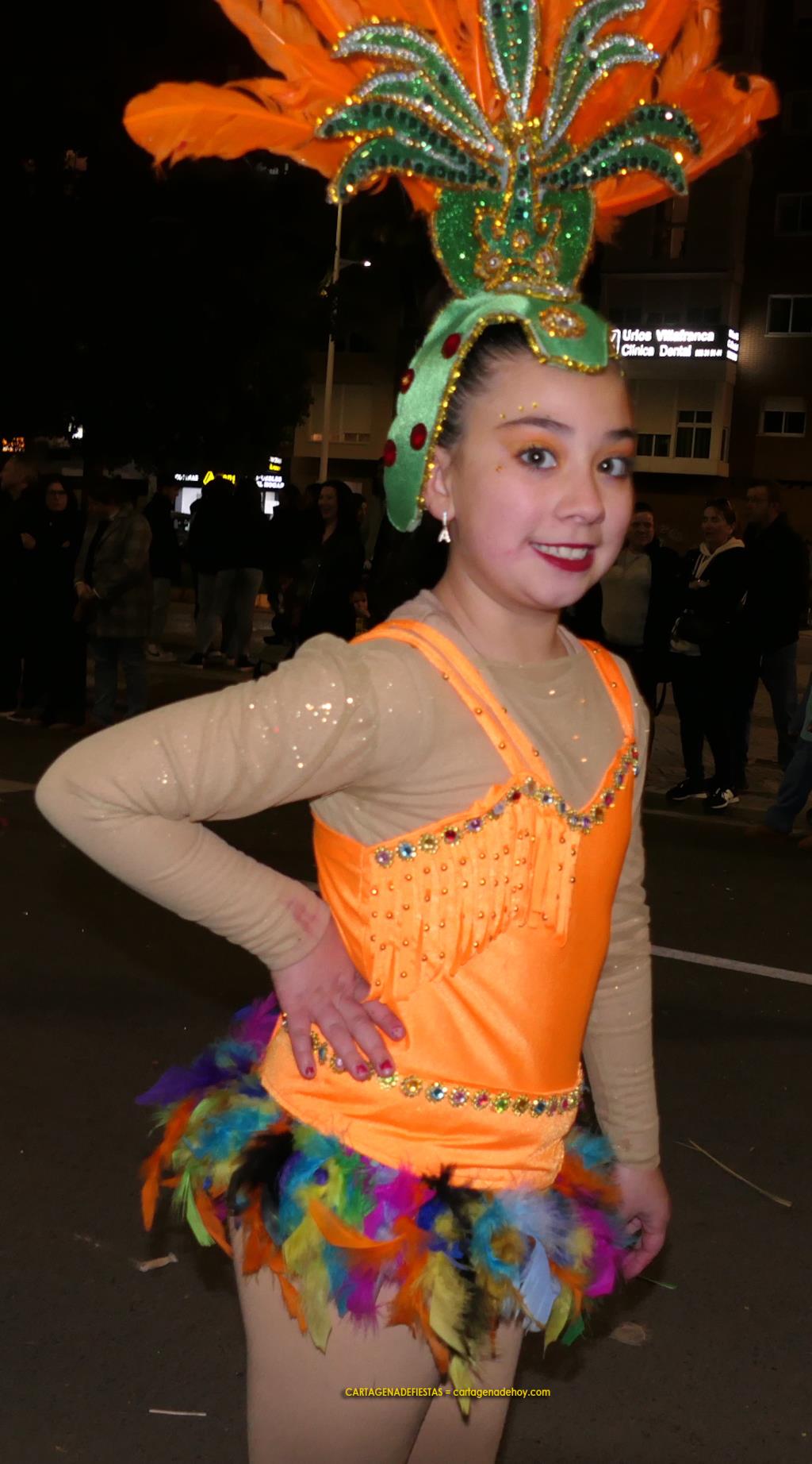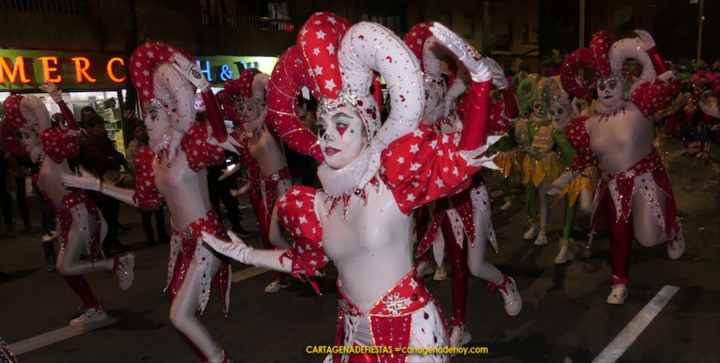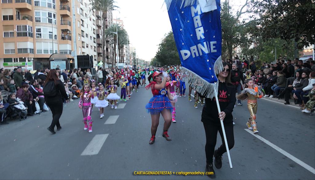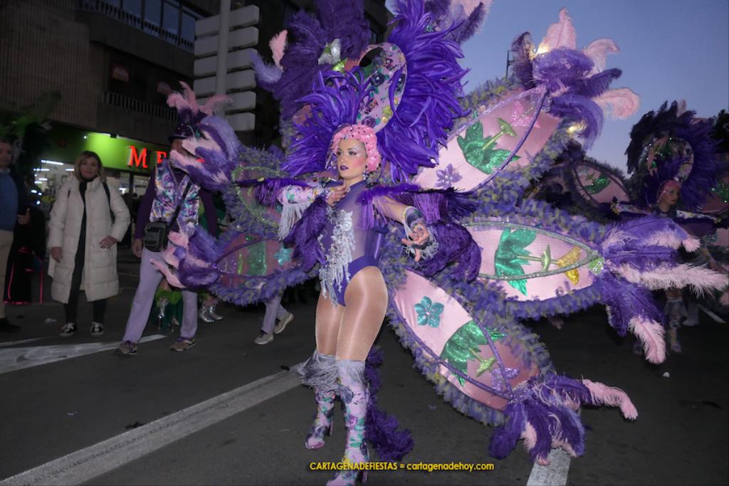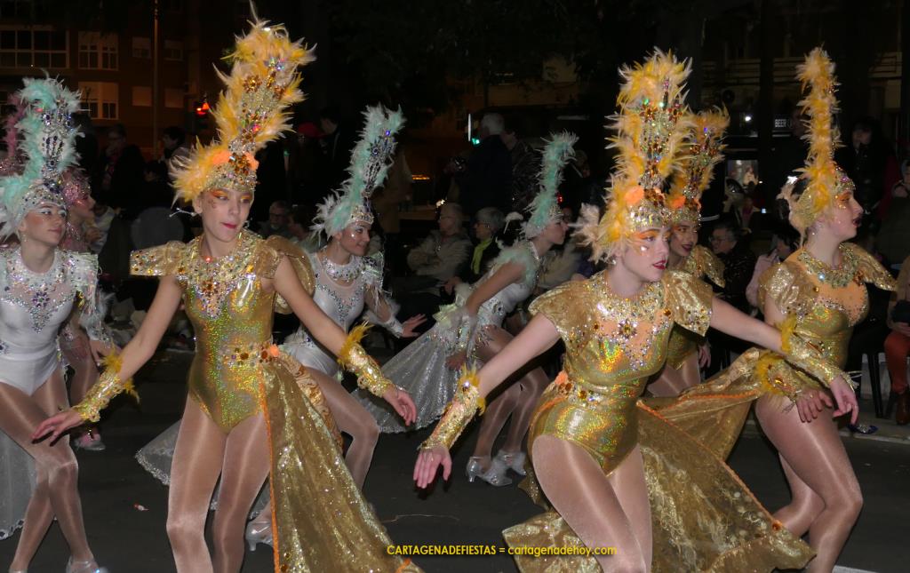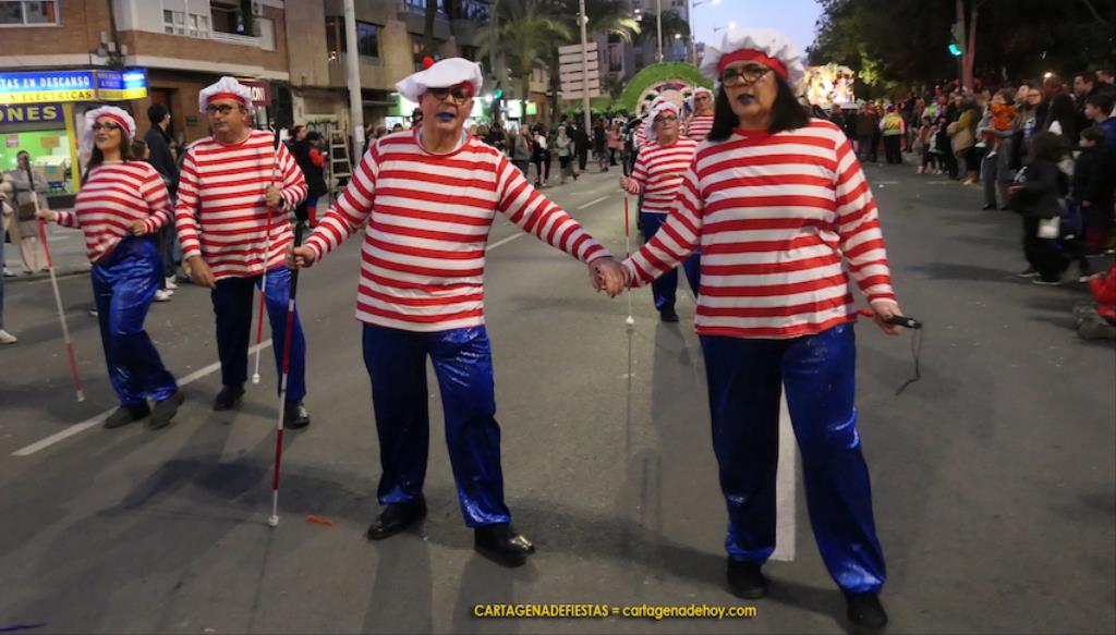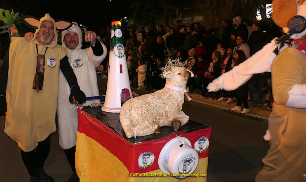 El desfile lo abrían colectivos no carnavaleros, pero habituales al desfile, como Viva Gym y los scout de Inhala Panzy de Canteras, dando paso a la carroza de la doble versión (adulta e infantil) de Don Carnal y Doña Cuaresma. A continuación las entrañables comparsas infantiles, donde muchos integrantes desmuestran ya sus ilusión por esta fiesta. Siguieron los mayores con variados disfraces, desde 'Barbie' hasta los protagonistas de 'Lo que el viento se llevó' (Barriada Virgen de la Caridad), cerrando la carroza con los reyes de este año, surgidos de La Manga.