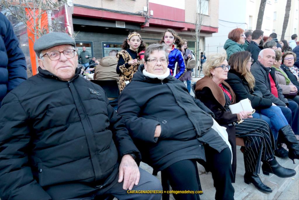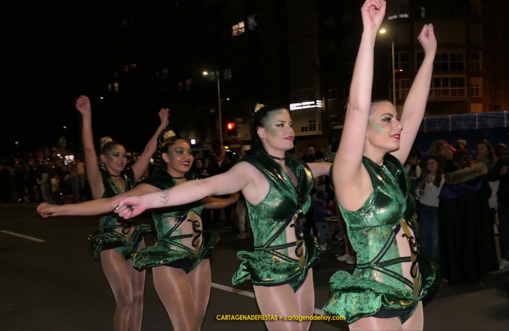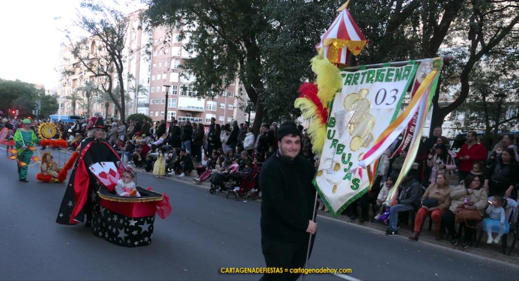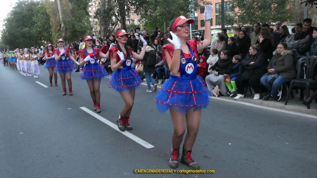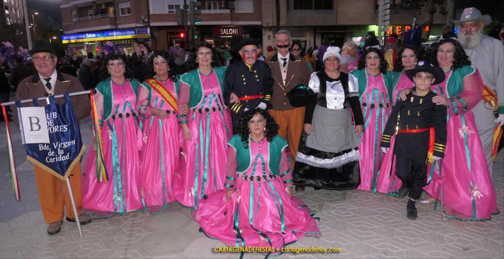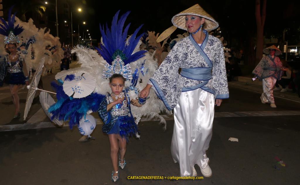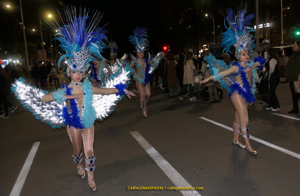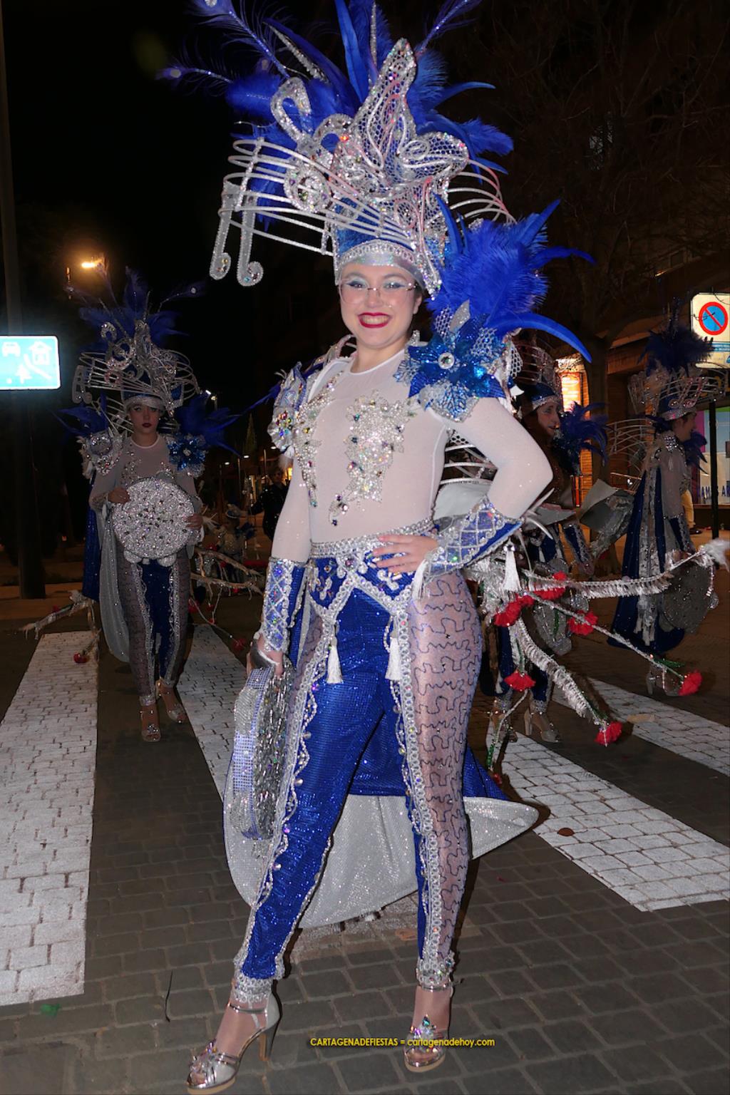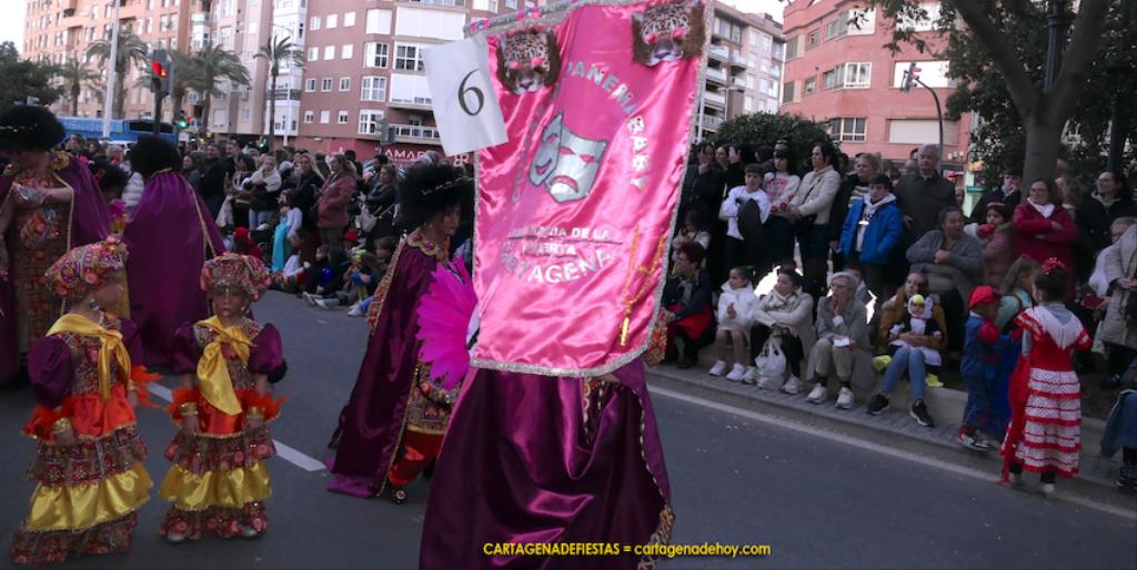 El desfile lo abrían colectivos no carnavaleros, pero habituales al desfile, como Viva Gym y los scout de Inhala Panzy de Canteras, dando paso a la carroza de la doble versión (adulta e infantil) de Don Carnal y Doña Cuaresma. A continuación las entrañables comparsas infantiles, donde muchos integrantes desmuestran ya sus ilusión por esta fiesta. Siguieron los mayores con variados disfraces, desde 'Barbie' hasta los protagonistas de 'Lo que el viento se llevó' (Barriada Virgen de la Caridad), cerrando la carroza con los reyes de este año, surgidos de La Manga.