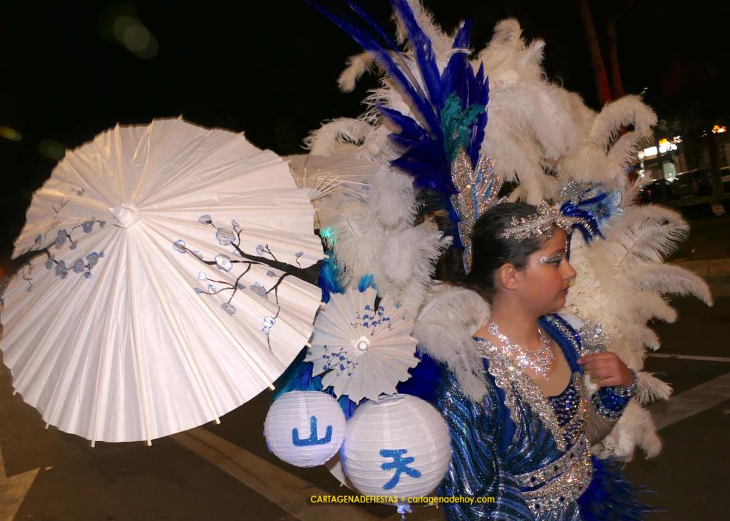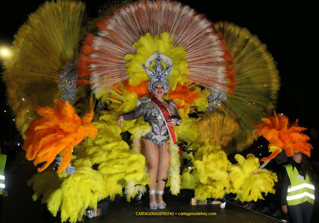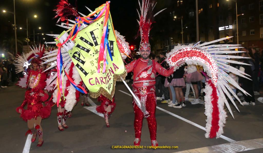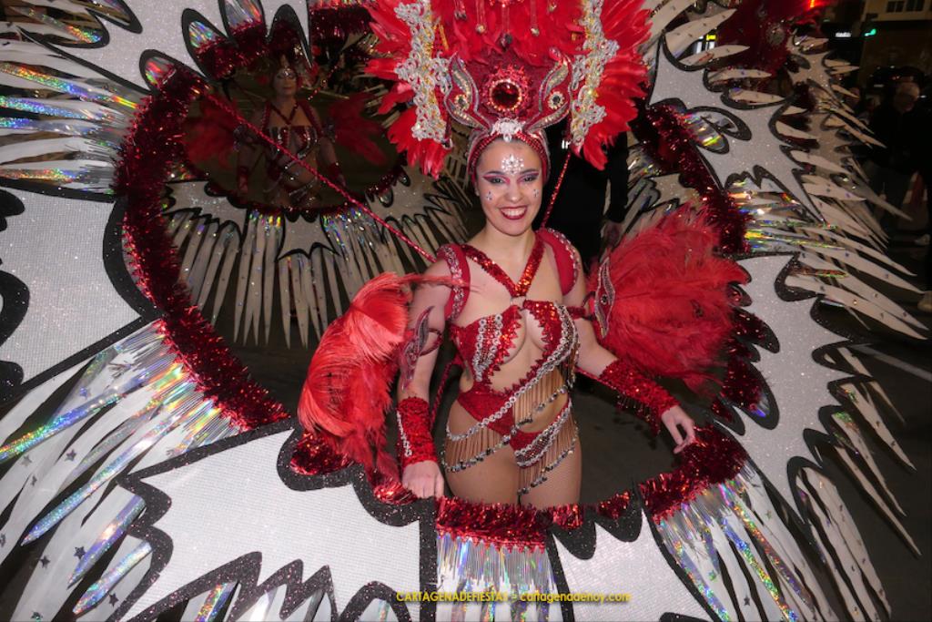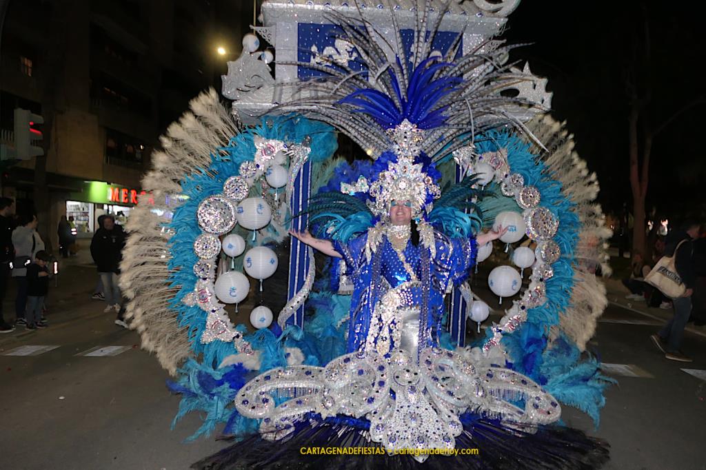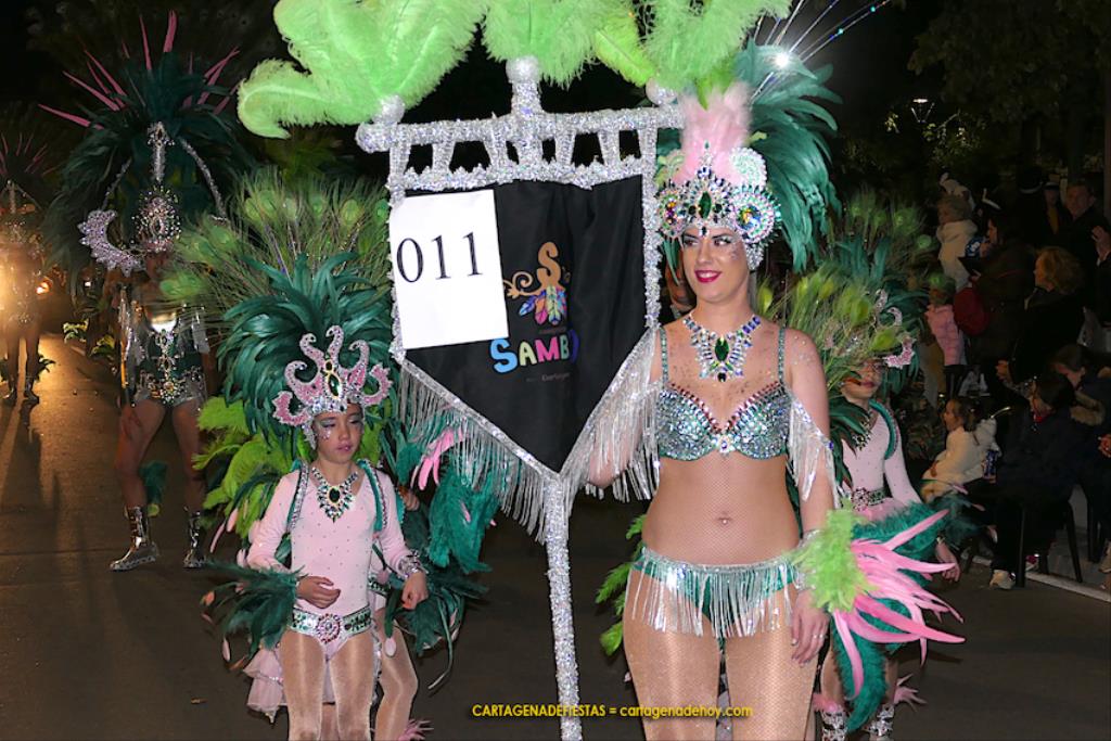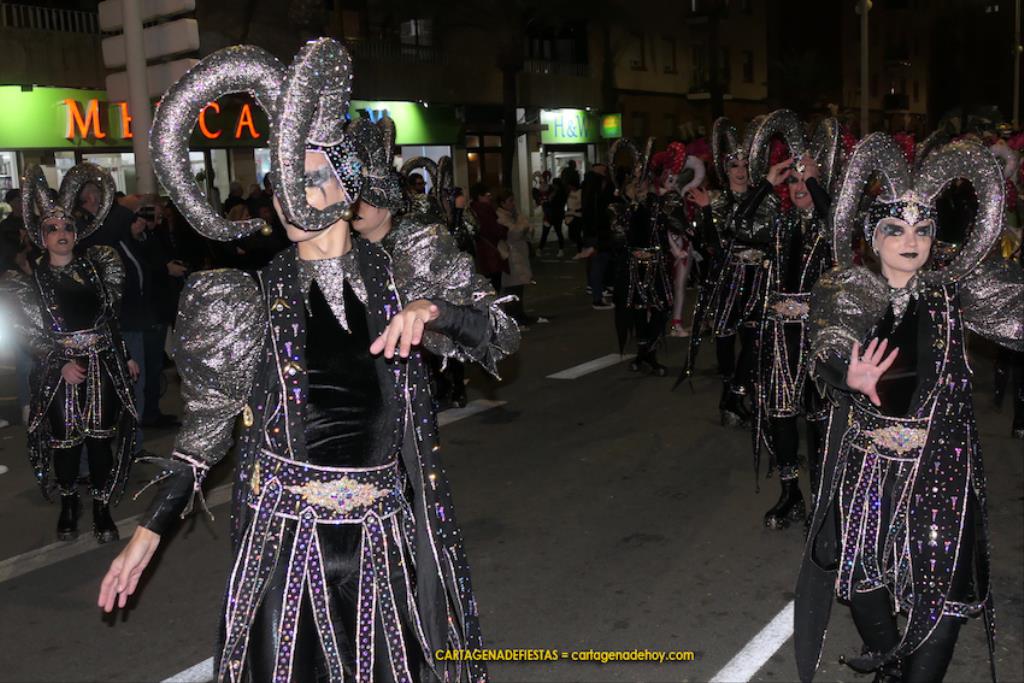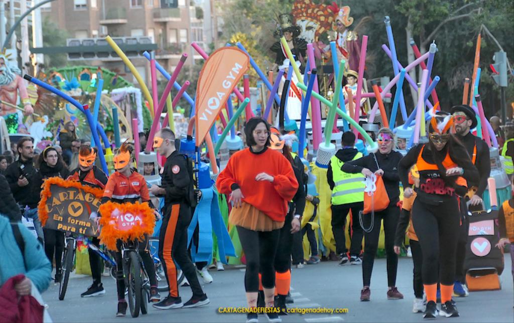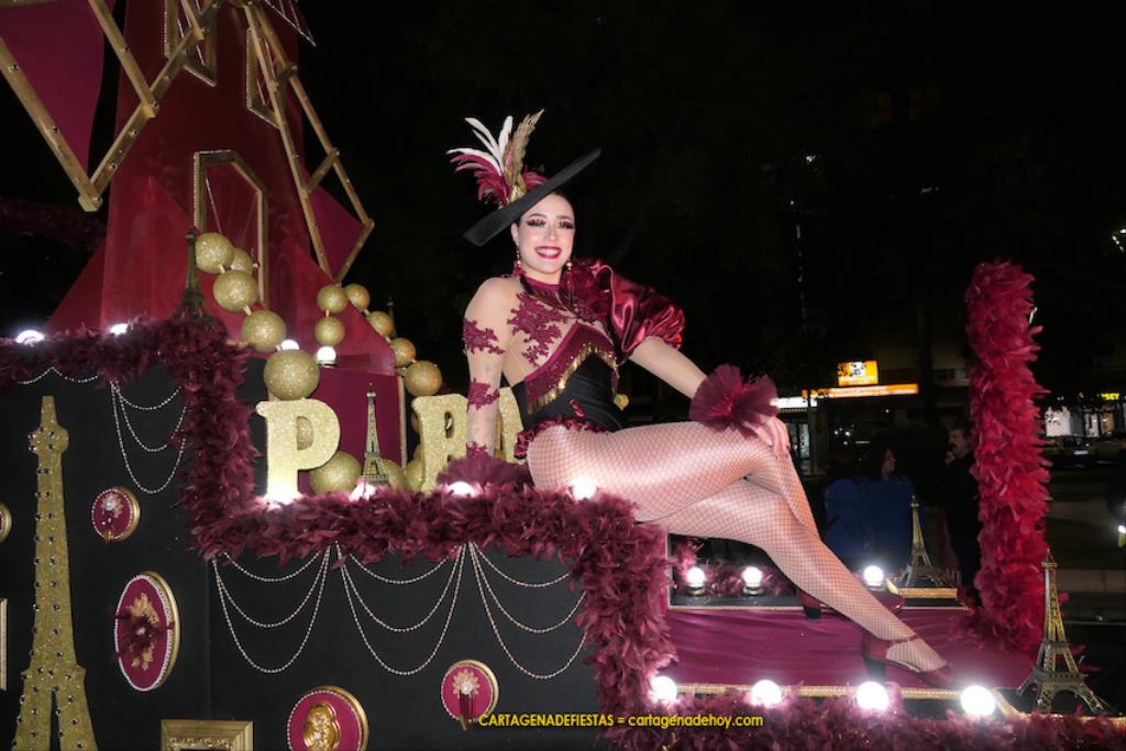 El desfile lo abrían colectivos no carnavaleros, pero habituales al desfile, como Viva Gym y los scout de Inhala Panzy de Canteras, dando paso a la carroza de la doble versión (adulta e infantil) de Don Carnal y Doña Cuaresma. A continuación las entrañables comparsas infantiles, donde muchos integrantes desmuestran ya sus ilusión por esta fiesta. Siguieron los mayores con variados disfraces, desde 'Barbie' hasta los protagonistas de 'Lo que el viento se llevó' (Barriada Virgen de la Caridad), cerrando la carroza con los reyes de este año, surgidos de La Manga.