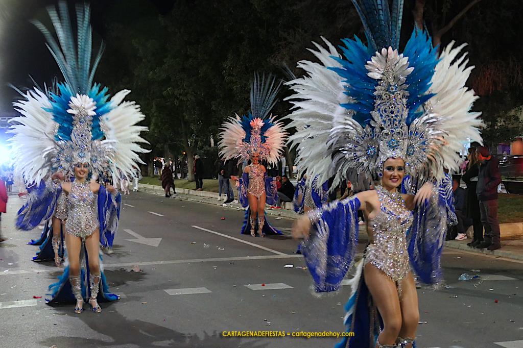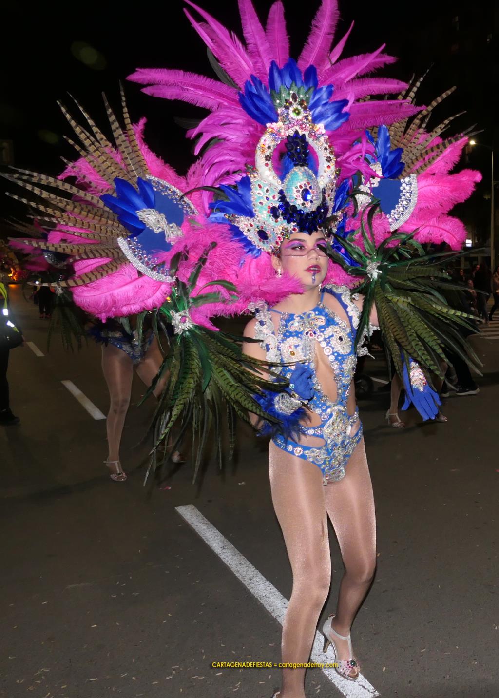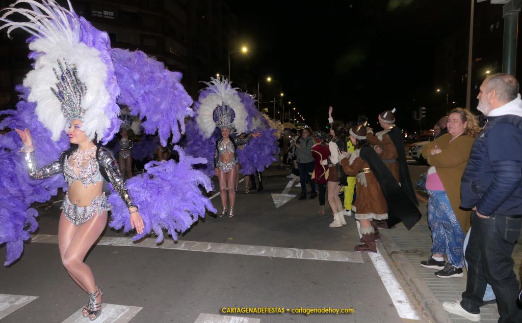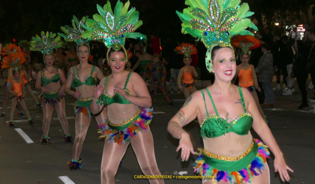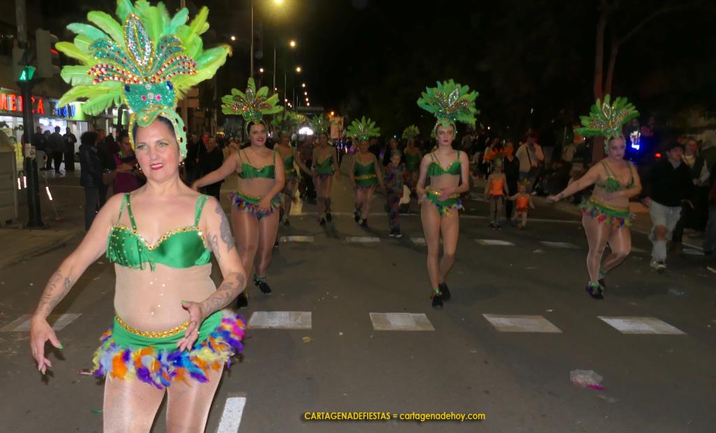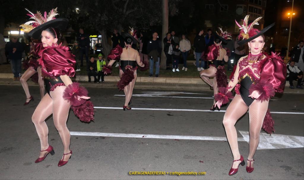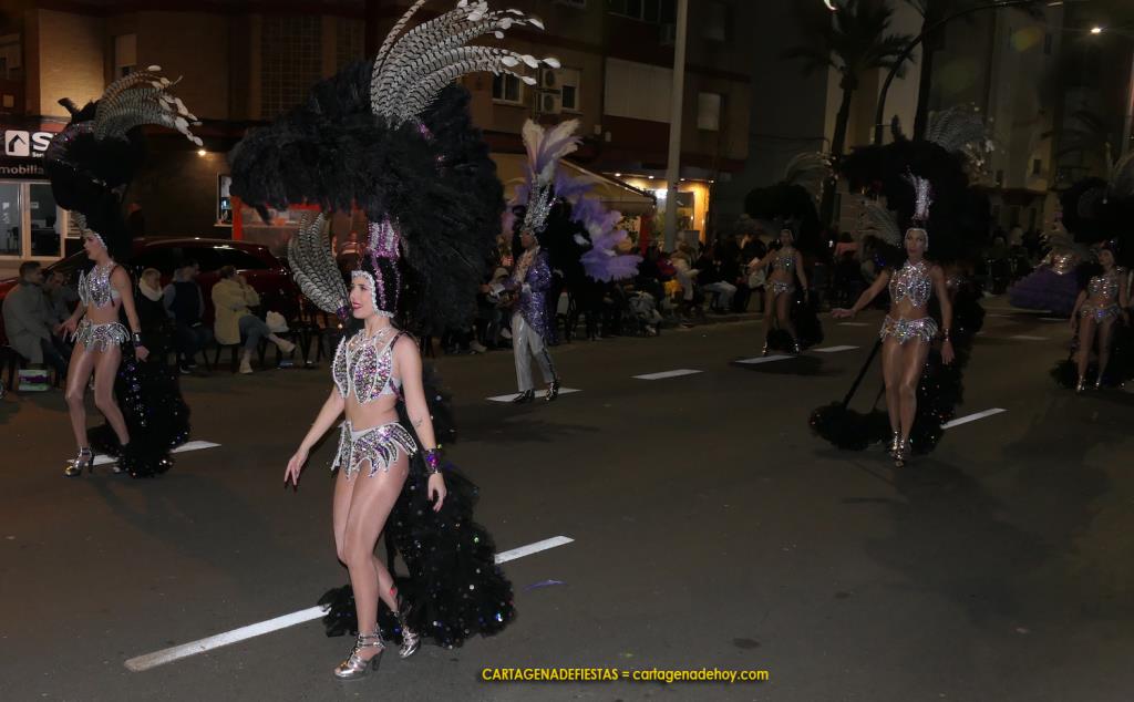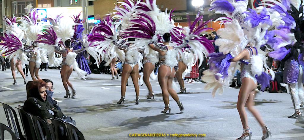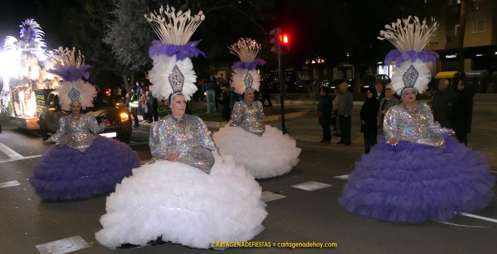 La Real e Ilustre de Vista Alegre puso la 'aborregada' crítica de este año, lo que tiene artículo propio en este periódico de Cartagena y su gente, al igual que el novedoso e inclusivo grupo de la ONCE. Nos queda referirnos a las comparsas adultas. Mucha pluma, ritmo coordinado e imaginación. Fueron, demás de las mentadas arriba: Sambao, Aporué, Atalaya, Ipanema, Divertilandia, Imagine, Renacer, Perseídas (las más 'carnales'), Deja Vu, Nova Carthago Paraíso, Antares, Ilusión de Galifa (con 3 plataformas), Las Villas de San Antón y las dolorenses de Limón y Sal.