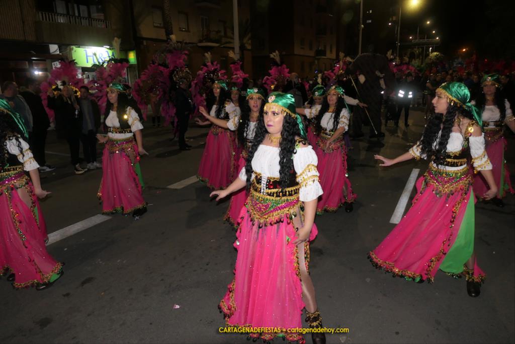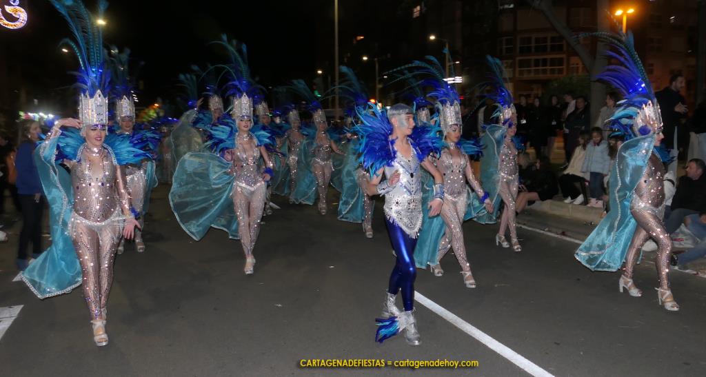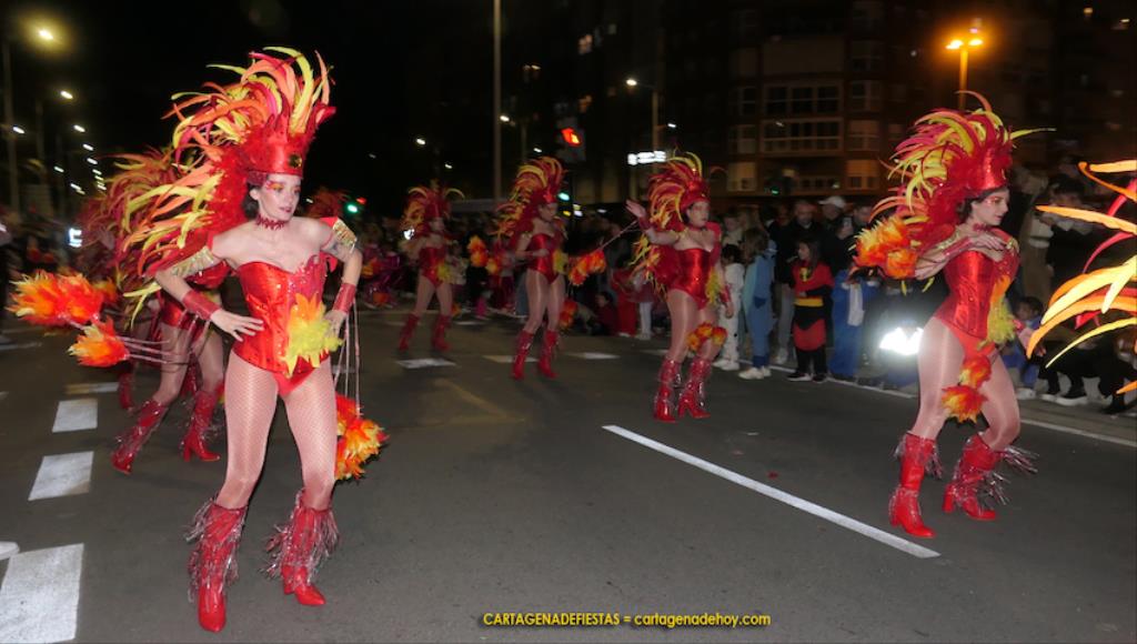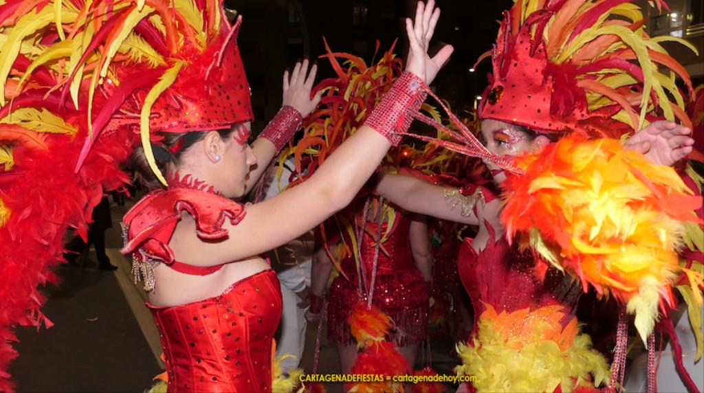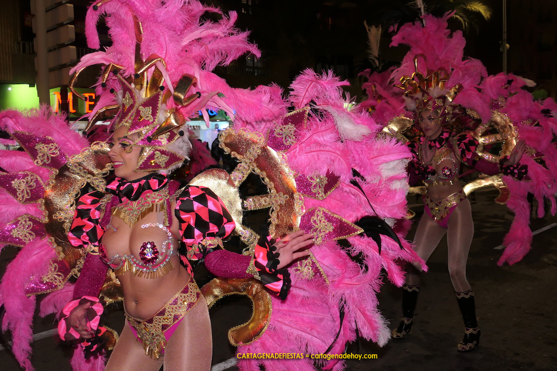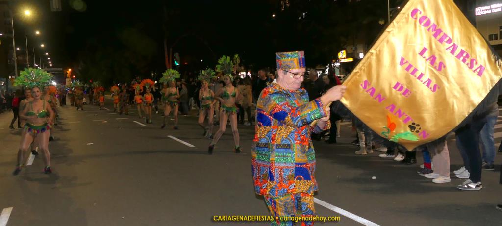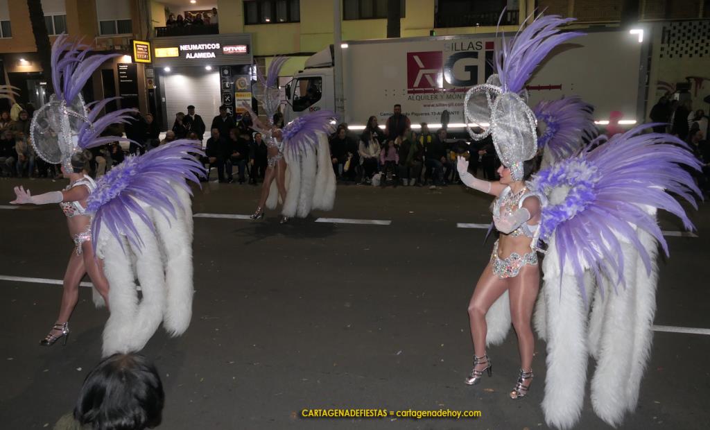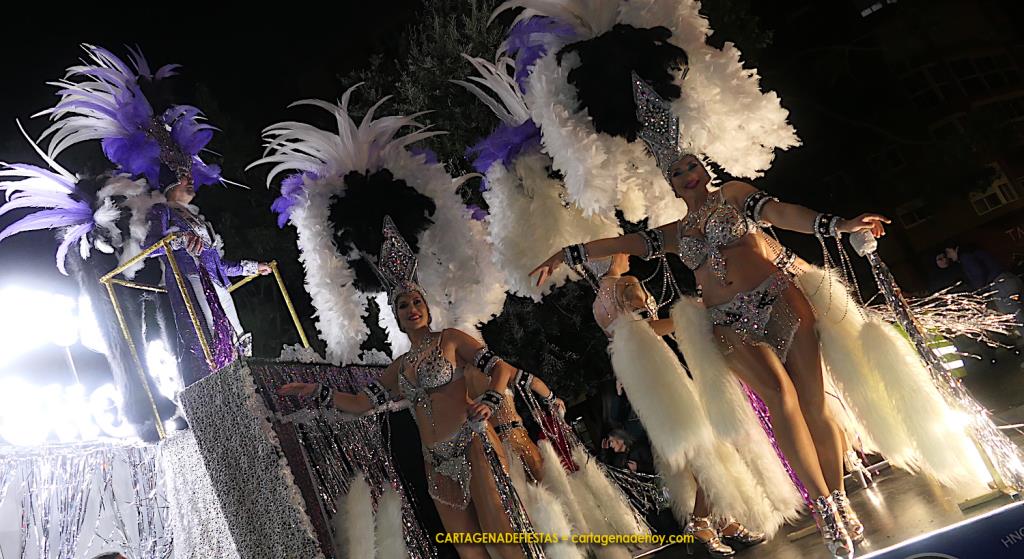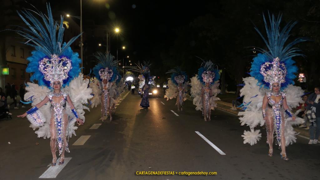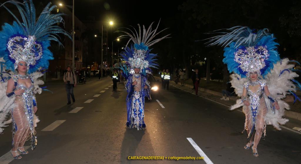 La Real e Ilustre de Vista Alegre puso la 'aborregada' crítica de este año, lo que tiene artículo propio en este periódico de Cartagena y su gente, al igual que el novedoso e inclusivo grupo de la ONCE. Nos queda referirnos a las comparsas adultas. Mucha pluma, ritmo coordinado e imaginación. Fueron, demás de las mentadas arriba: Sambao, Aporué, Atalaya, Ipanema, Divertilandia, Imagine, Renacer, Perseídas (las más 'carnales'), Deja Vu, Nova Carthago Paraíso, Antares, Ilusión de Galifa (con 3 plataformas), Las Villas de San Antón y las dolorenses de Limón y Sal.