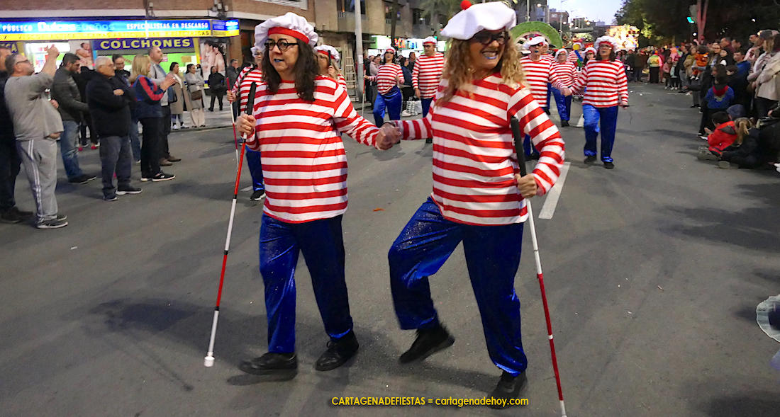 Once y once son 22, los integrantes de la primera comparsa que tiene el gran desfile del Carnaval de Cartagena con personas que sufren problemas de visión. Han estado ensayando durante bastantes semanas para demostrar 'su capacidad' (que no incapacidad) en esta sociedad y el resultado fue muy brillante en todo su recorrido por las calles de la ciudad.