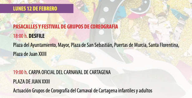 La actividad en la popular fiesta cartagenera se centra en la tarde, con desfile de grupos coreográficos a partir de las seis de la tarde, culminando una hora más tarde con actuaciones en la carpa de la plaza de Juan XXIII.