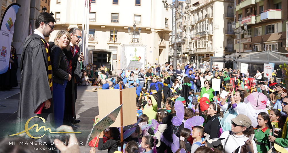 Alumnos de los centros Pipiripao, Nuestra Señora del Mar, Colegio Narval, Primitiva López, Patronato Sagrado Corazón de Jesús, La Concepción y Cuatro Santos han ofrecido, en una calurosa mañana, un animado desfile que ha culminado ante el Palacio Consistorial, donde ha sido recibido por la alcaldesa y ediles del Ayuntamiento de Cartagena.