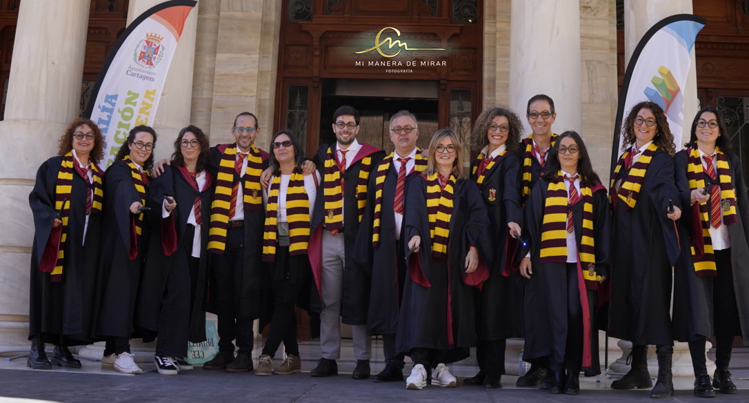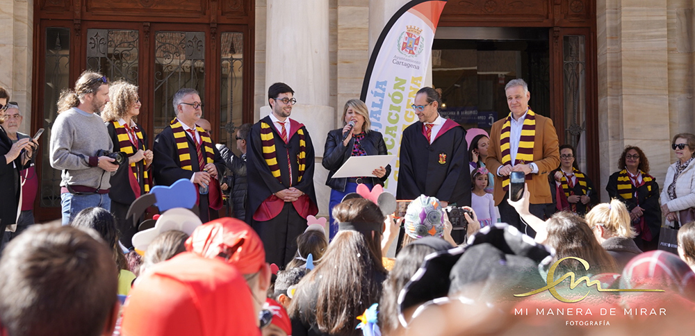 En las puertas del Palacio Consistorial han sido recibidos por la alcaldesa, Noelia Arroyo. Por su parte, el concejal de Educación, Ignacio Jáudenes, ha formado parte del desfile junto al presidente de la Federación de Carnaval de Cartagena, Eduardo Pignatelli, ambos caracterizados de Harry Potter.