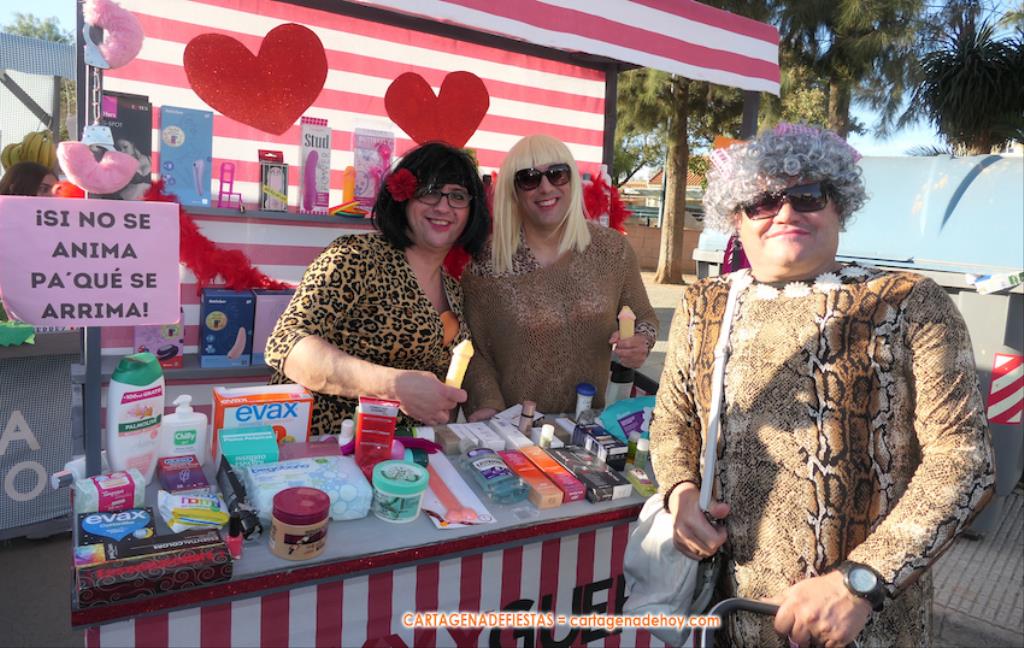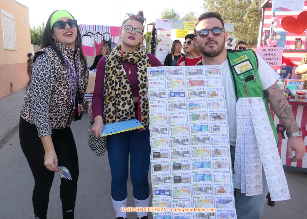 En nuestra cobertura de su pasacalles nos llamó esta vez poderosamente la atención ver el mercadillo de los jueves en movimiento. Es una escena nada habitual la generada por la peña 'Arrebataos', en la que, como puede verse en las fotografías, cada integrante llevaba un puesto, desde la carne, la fruta o la ropa hasta productos eróticos o patatas fritas, no faltando detalles como la presencia de policías locales y del vendedor de los cupones.