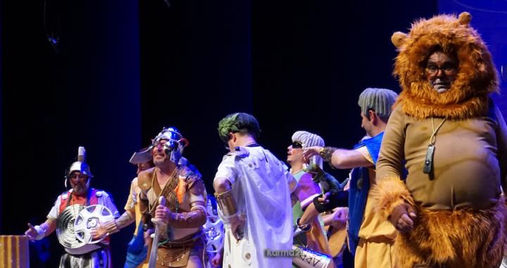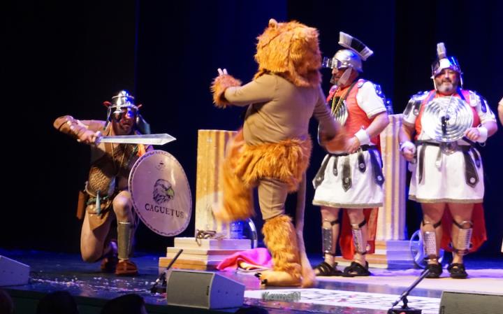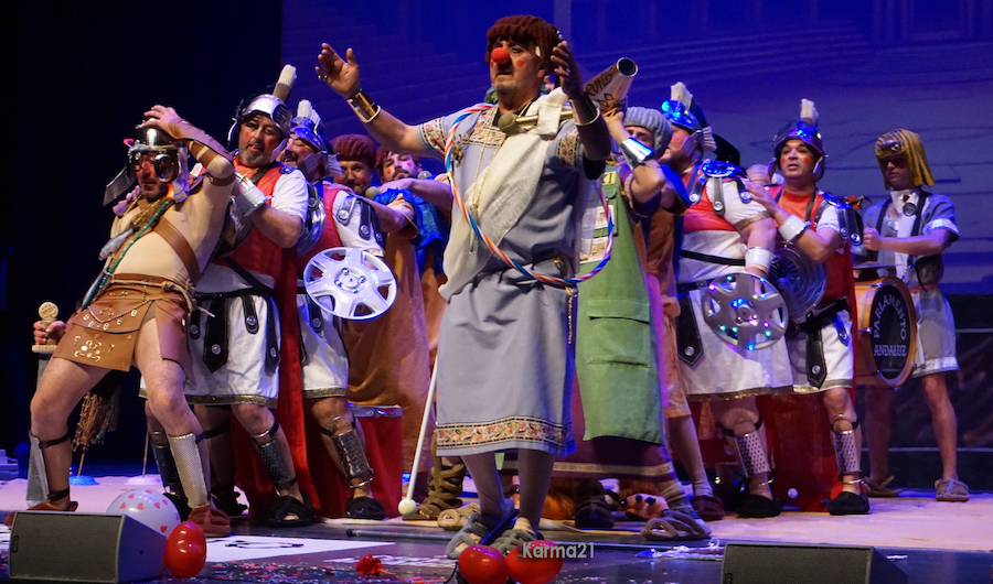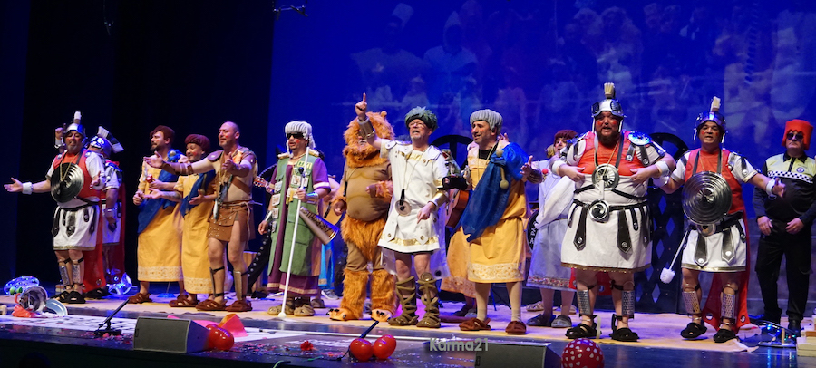 El grupo de Santa Lucía ha celebrado su 25 aniversario este año en el concurso de chirigotas del Carnaval de Cartagena con la representación de 'Cartagonova Imperium Festival', culminando con una canción de despedida en la que fueron nombrando los tipos que han lucido en este cuarto de siglo mientras iban saliendo amigos que los lucían.
