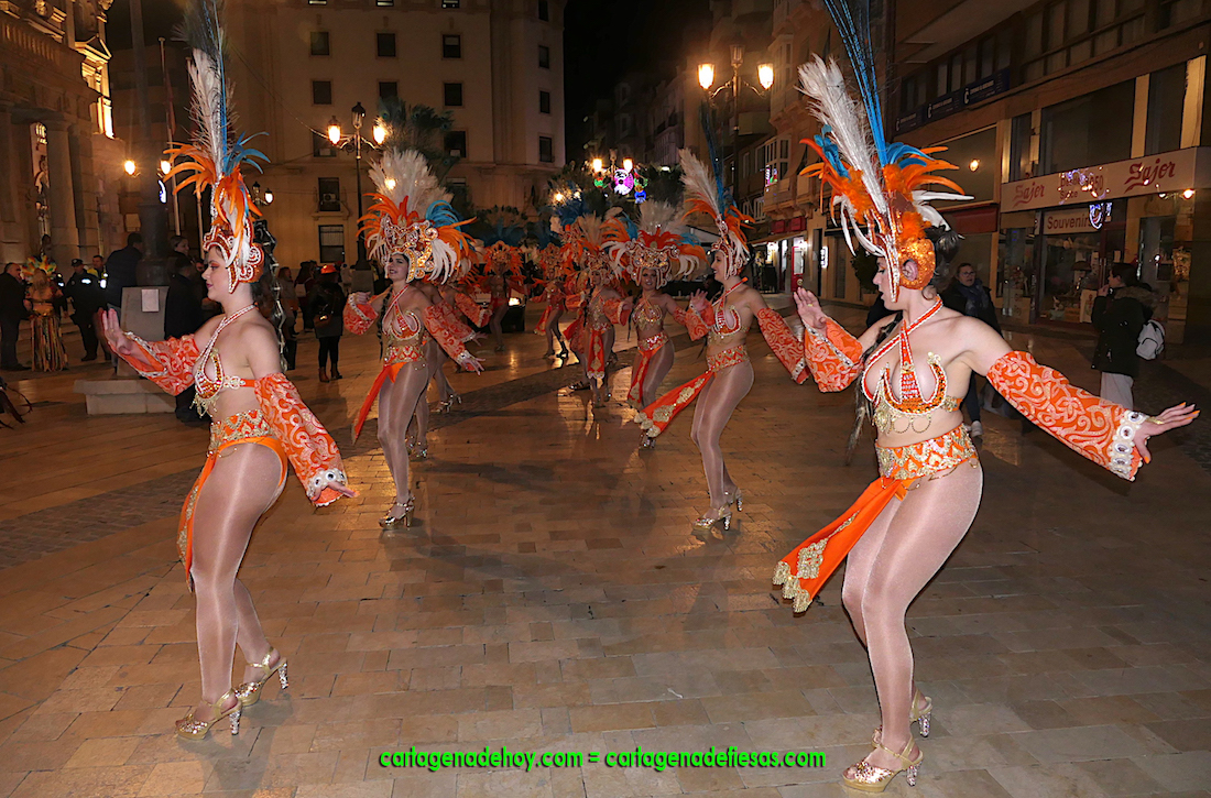 Penúltima de las doce jornadas que abarca el Carnaval de Cartagena. Por la tarde, desde las 18 horas, desfiles de grupos coreográficos por la ciudad y posterior exhibición de bailes en la carpa de Plaza Mayor en el puerto.