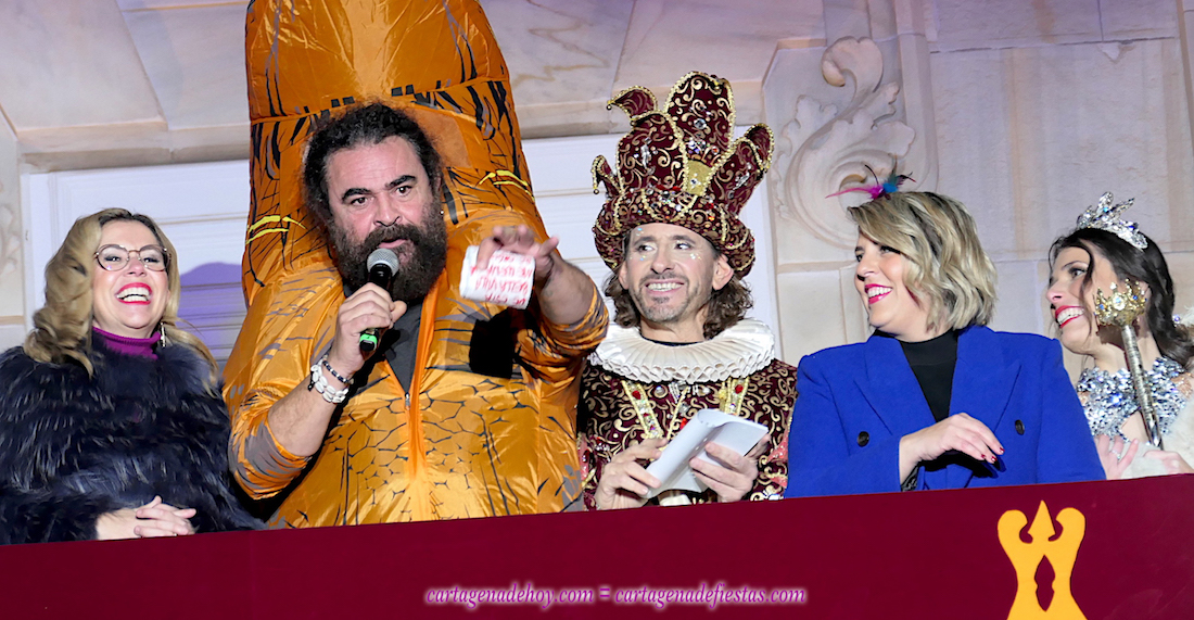 Miguel Ángel Rodríguez 'El Sevilla', tras una pequeña ruta barista y posar innumerables veces con los espectadores que se lo han pedido al paso del desfile del que ha formado parte, ha comenzado su gracioso pregón disfrazado de dinosaurio (para ser contratado para el parque de Sauces) para después 'capitalizar' a Cartagena, motivar a los carnavaleros y dejar caer la posibilidad de que contraten a sus 'Mojinos Escozíos' para una futura actuación por estos lares.