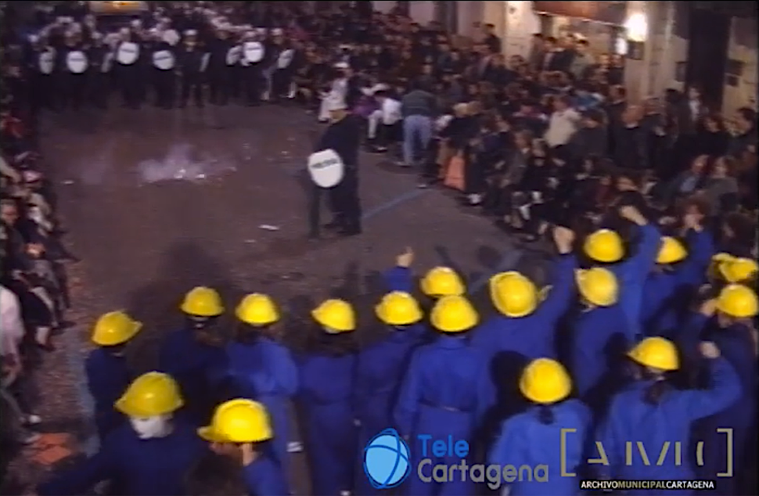 El gran desfile de la popular fiesta tuvo lugar el 25 de febrero, el mes que había registrado en sus primeros días los incidentes por la crisis industrial en el paseo de Alfonso XIII, que incluyeron la quema de la Asamblea Regional. Sin embargo, los cartageneros no perdieron el sentido del humor y parodiaron estos enfrentamientos entre trabajadores y policías.