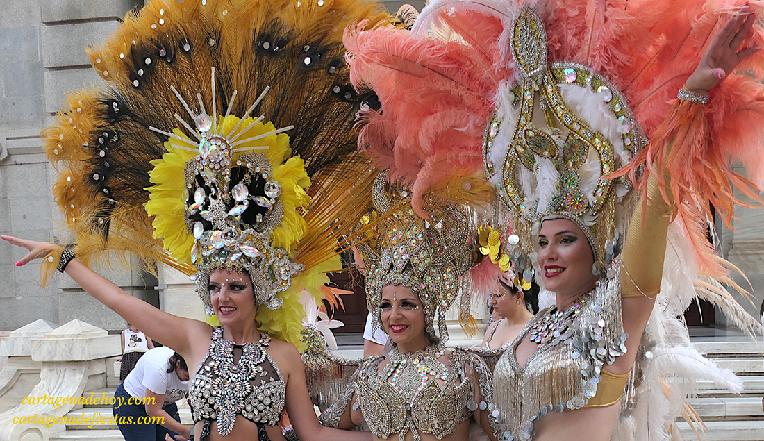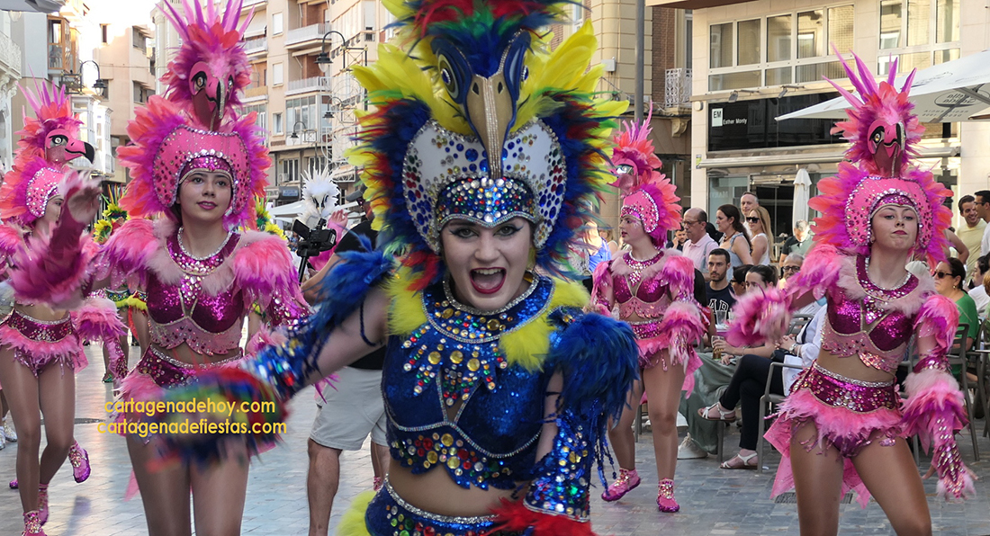 El pasacalles de la tarde de ayer de la fiestas carnavalera por el casco histórico de Cartagena tuvo como protagonistas a los animosos grupos coreográficos del Polígono Santa Ana y El Algar, respectivamente.