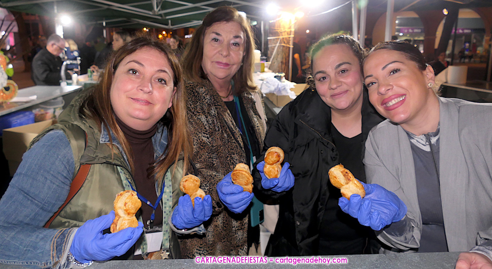 En el epílogo de la fiesta de clausura del Carnaval'24 de Cartagena tuvo lugar el reparto gratuito de 'las pelotas de Don Carnal' y 'las tetillas de Doña Cuaresma', que son hojaldres con contenido dispar, distinguiéndose unos de otros por las dos almendras exteriores. En la foto, el equipo de distribución.