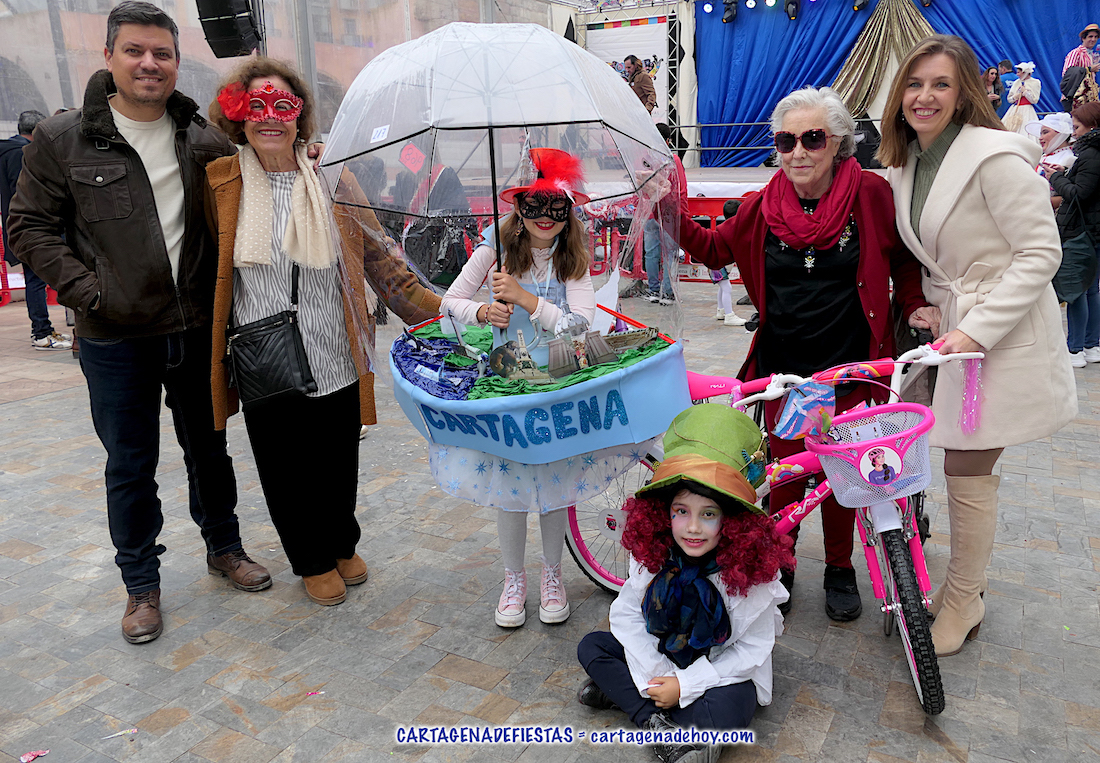 El disfraz que lució Salomé María López Sáez, una chica de 10 años de edad que estudia en Maristas, fue el principal triunfador del concurso de disfraces infantiles carnavalero de Cartagena. En la foto, posa con sus padres, abuelas y hermana.