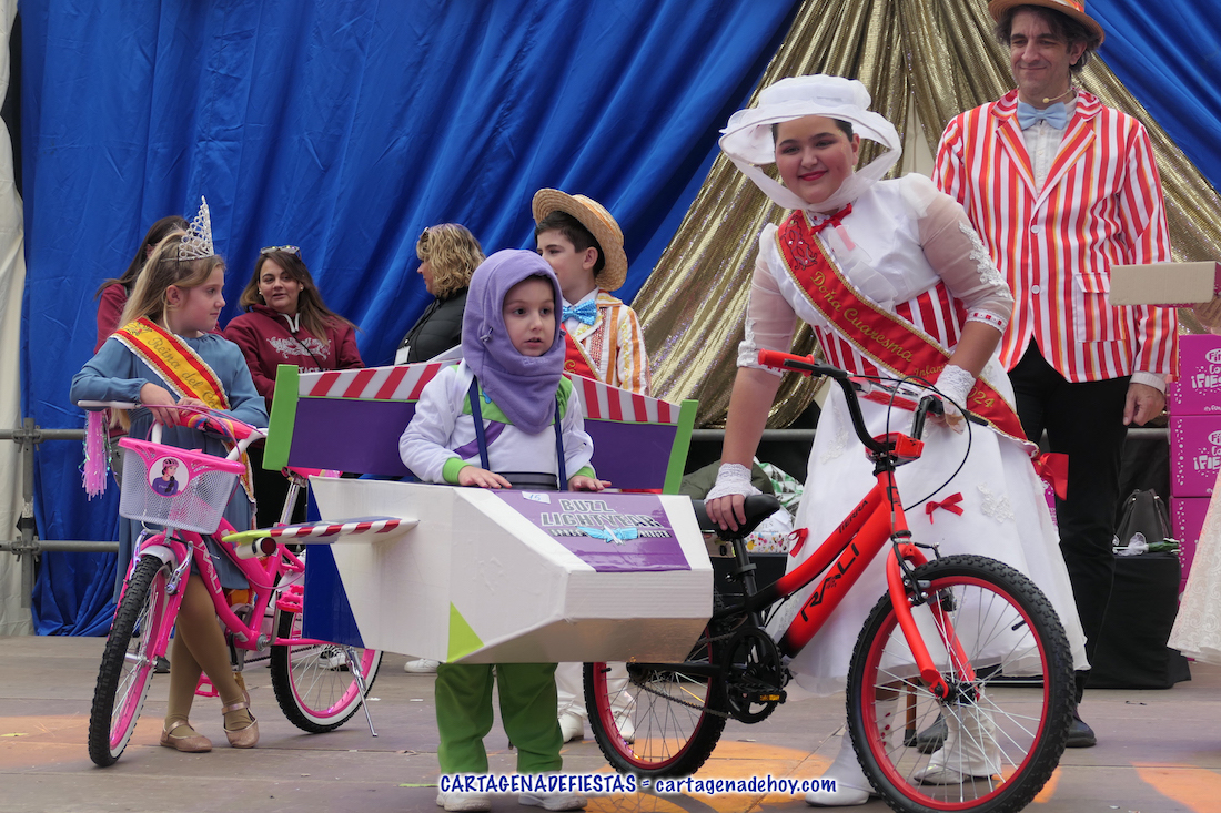 La carpa de la plaza de Juan XXIII se estrenó como marco del popular certamen en el que la lució la gran imaginación y variedad en los representaciones de los chavales. El acto fue presentado por Don Carnal y Doña Cuaresma infantiles y actores de la compañía Ditirambo representando personajes de Mary Poppins.