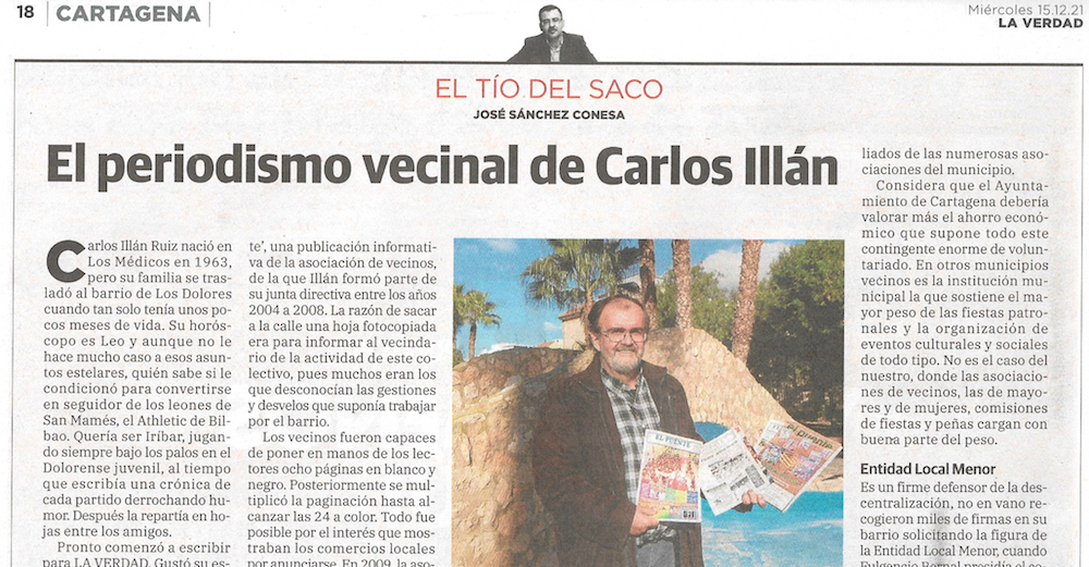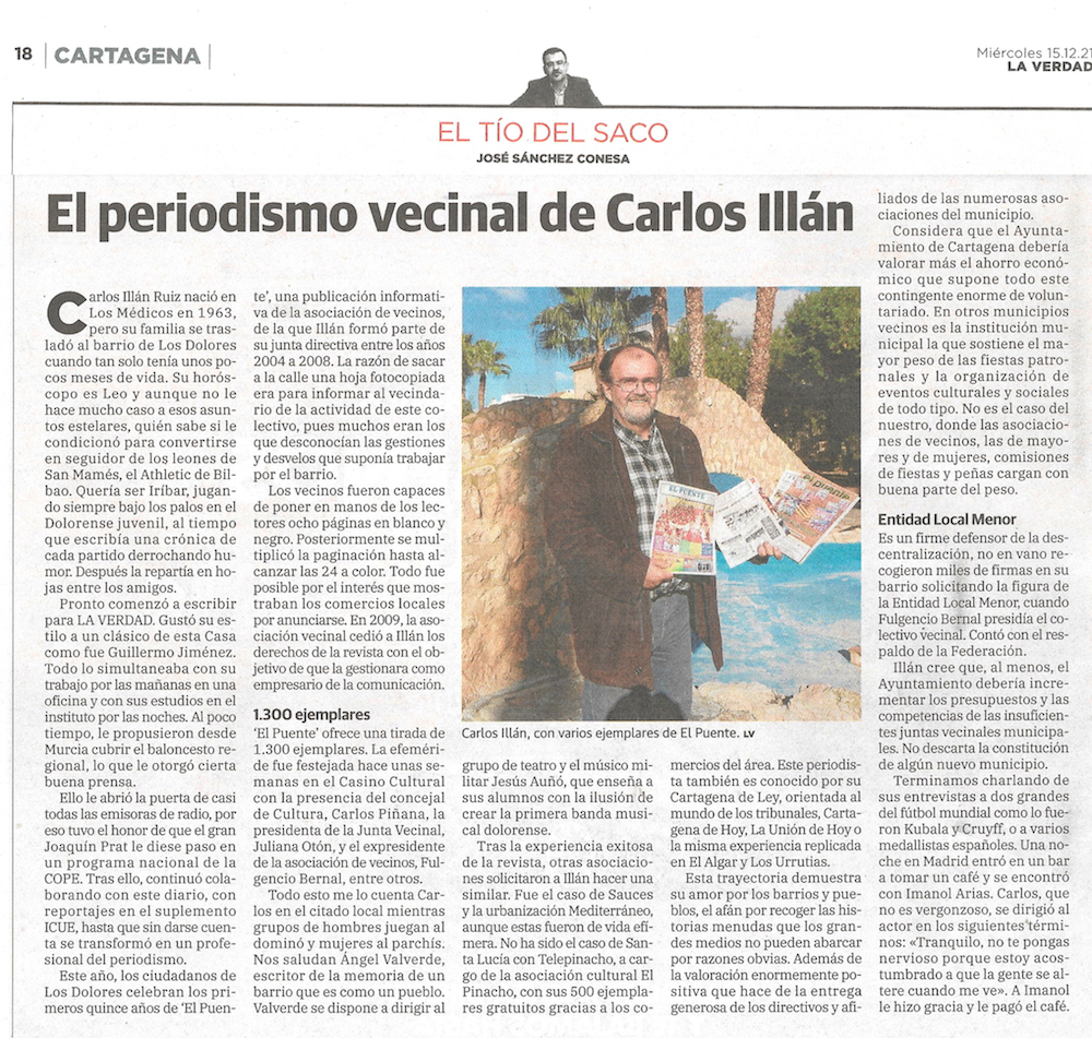 José Sánchez Conesa dedica su artículo de esta semana en la sección 'El tío del saco' del diario La Verdad al director del grupo de difusión e información 21DEhoy agenCYA, creador de Cartagena de Hoy y otros diarios digitales además de revistas de papel, como El Puente, que ha cumplido tres lustros de historia y que es el detonante que ha motivado el reportaje en el que el 'paladín de nuestras tradiciones' e integrante del equipo de cronistas oficiales de Cartagena efectúa un somero recorrido por la trayectoria del periodista, plasmando su devoción hacia las actividades que organizan altruistamente los vecinos y su pensamiento descentralizador.